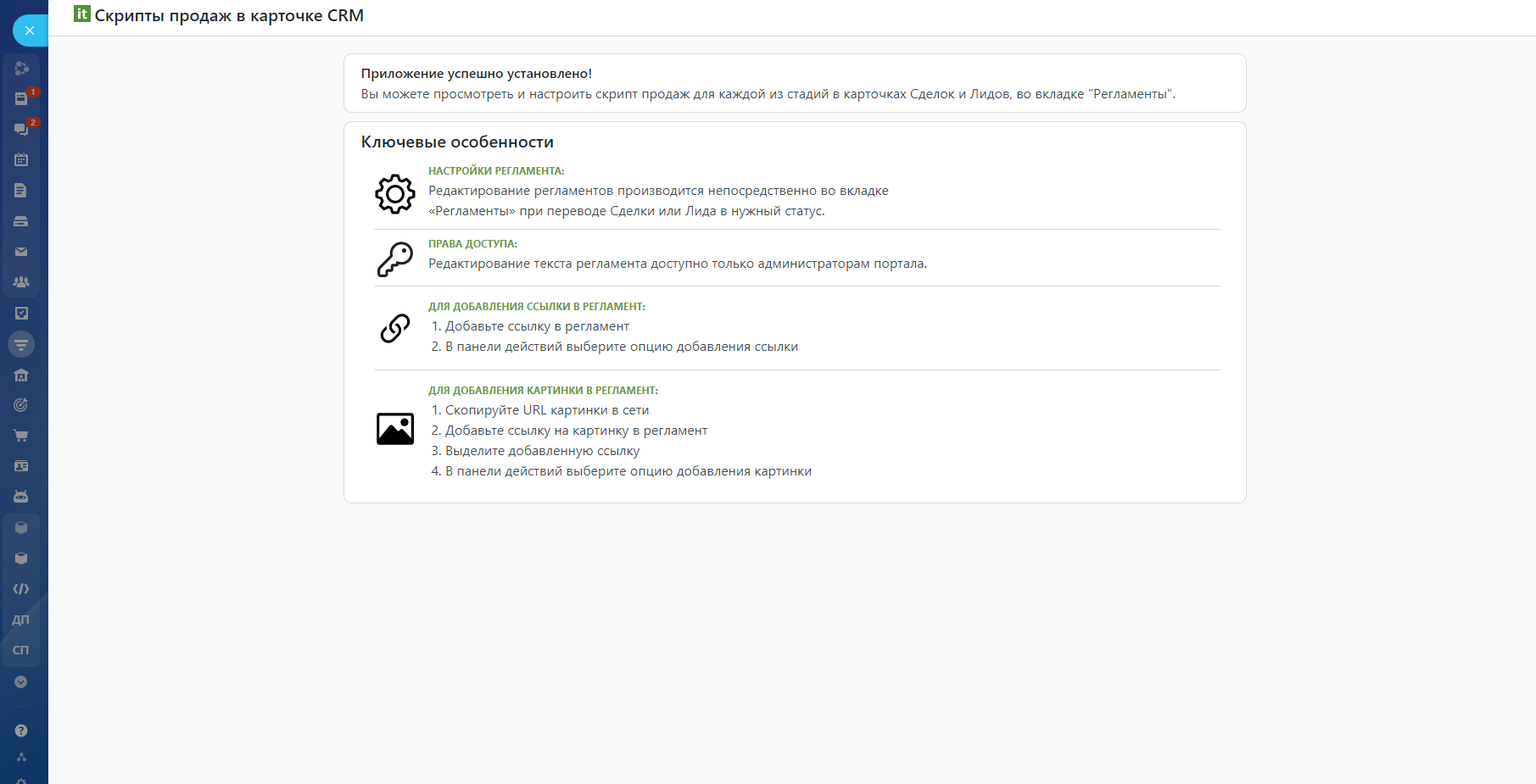 Приложение позволяет выводить в карточку Лида и Сделки свои скрипты продаж.