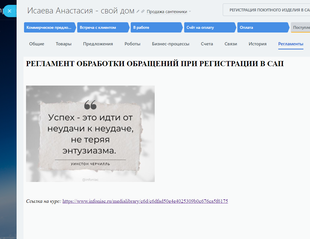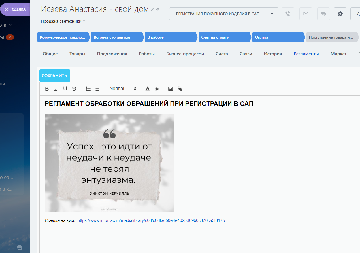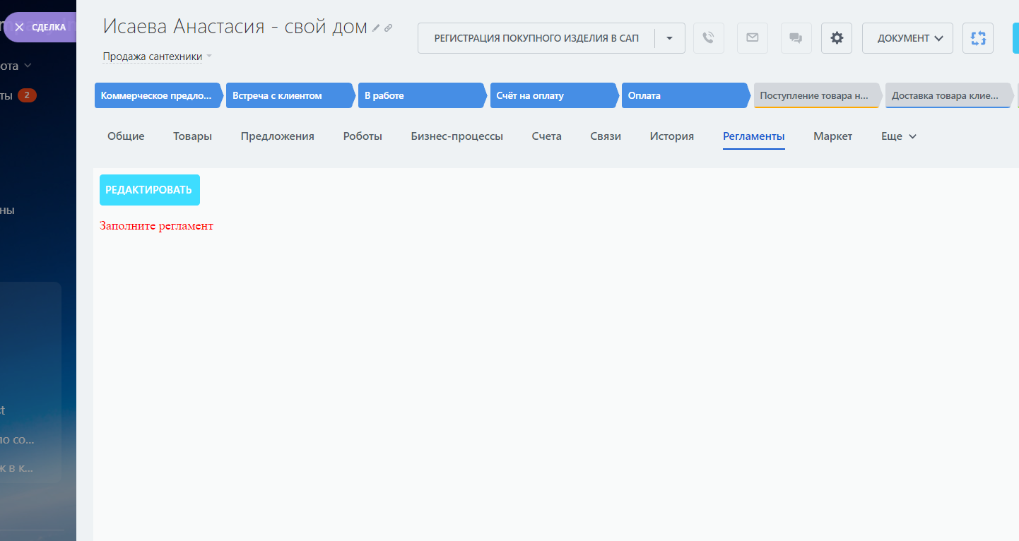 Редактирование регламентов производится непосредственно во вкладке «Регламенты» при переводе Сделки или Лида в нужный статус.