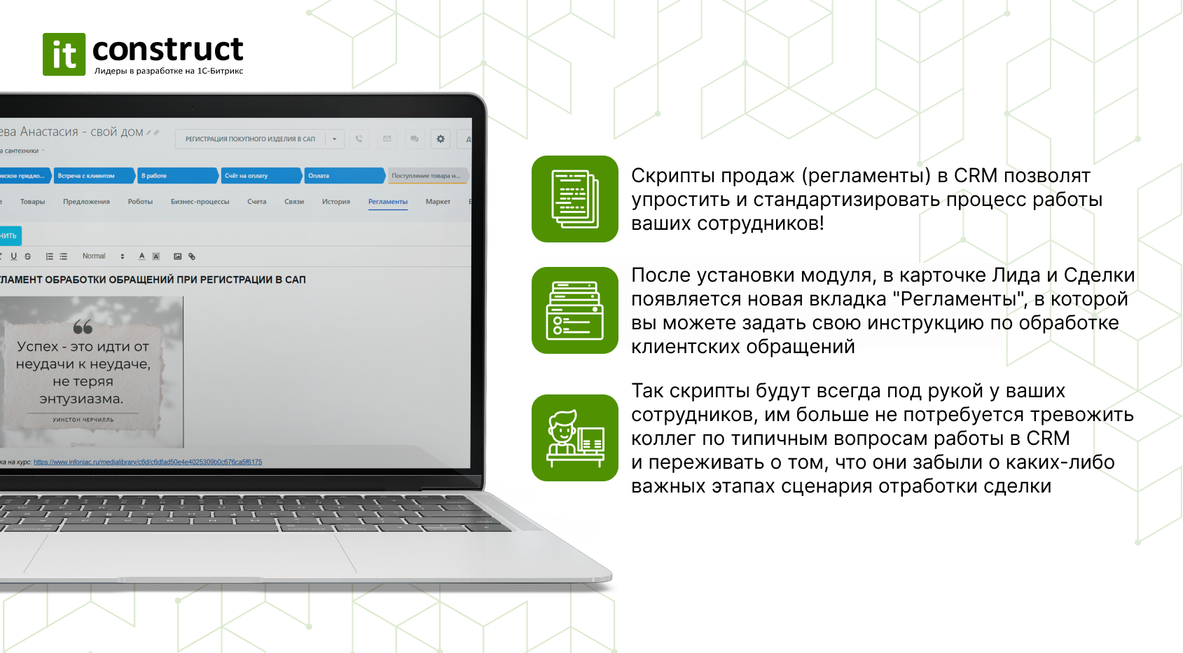Приложение "Скрипты продаж в карточке CRM" позволит упростить и стандартизировать процесс работы ваших сотрудников.