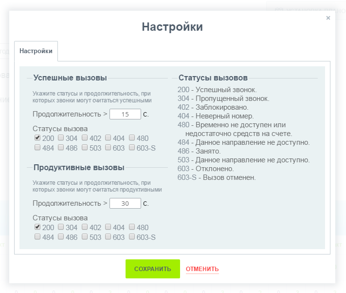 На данной вкладке задаётся настройки продолжительности и статусов звонков для отчета.