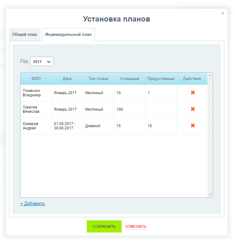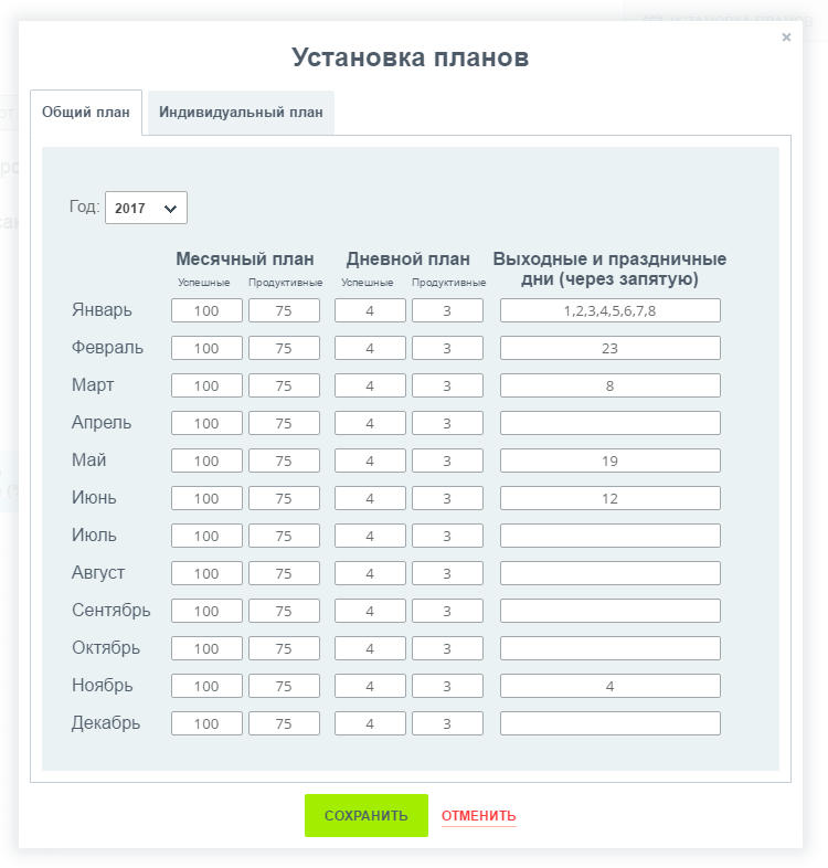 У каждого пользователя может быть несколько индивидуальных планов. Если у одного пользователя «пересекаются» индивидуальные планы (то есть, например на один и тот же месяц или день создано несколько планов с разным количеством звонков), то будет учитываться только тот, который ниже в списке.