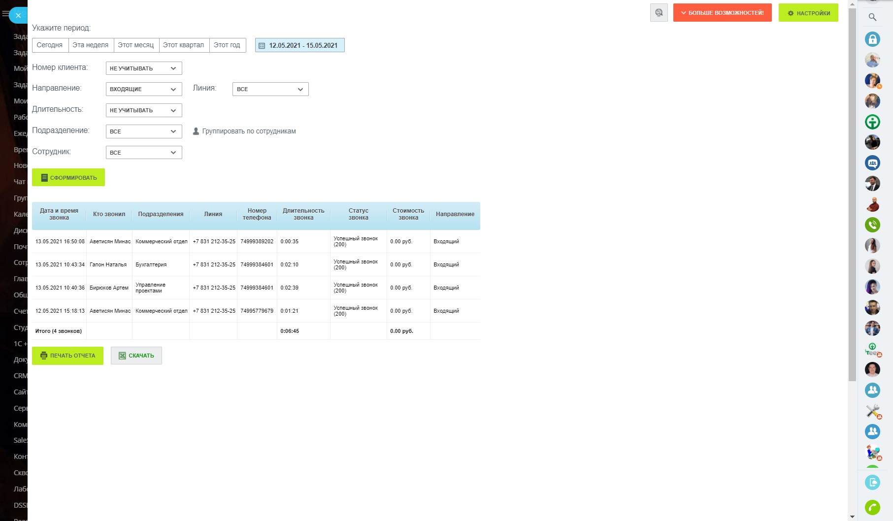 Стандартная детализация звонков Битрикс24 не позволяет смотреть итоговую статистику по длительности или стоимости разговоров за нужный период или по нужному сотруднику.