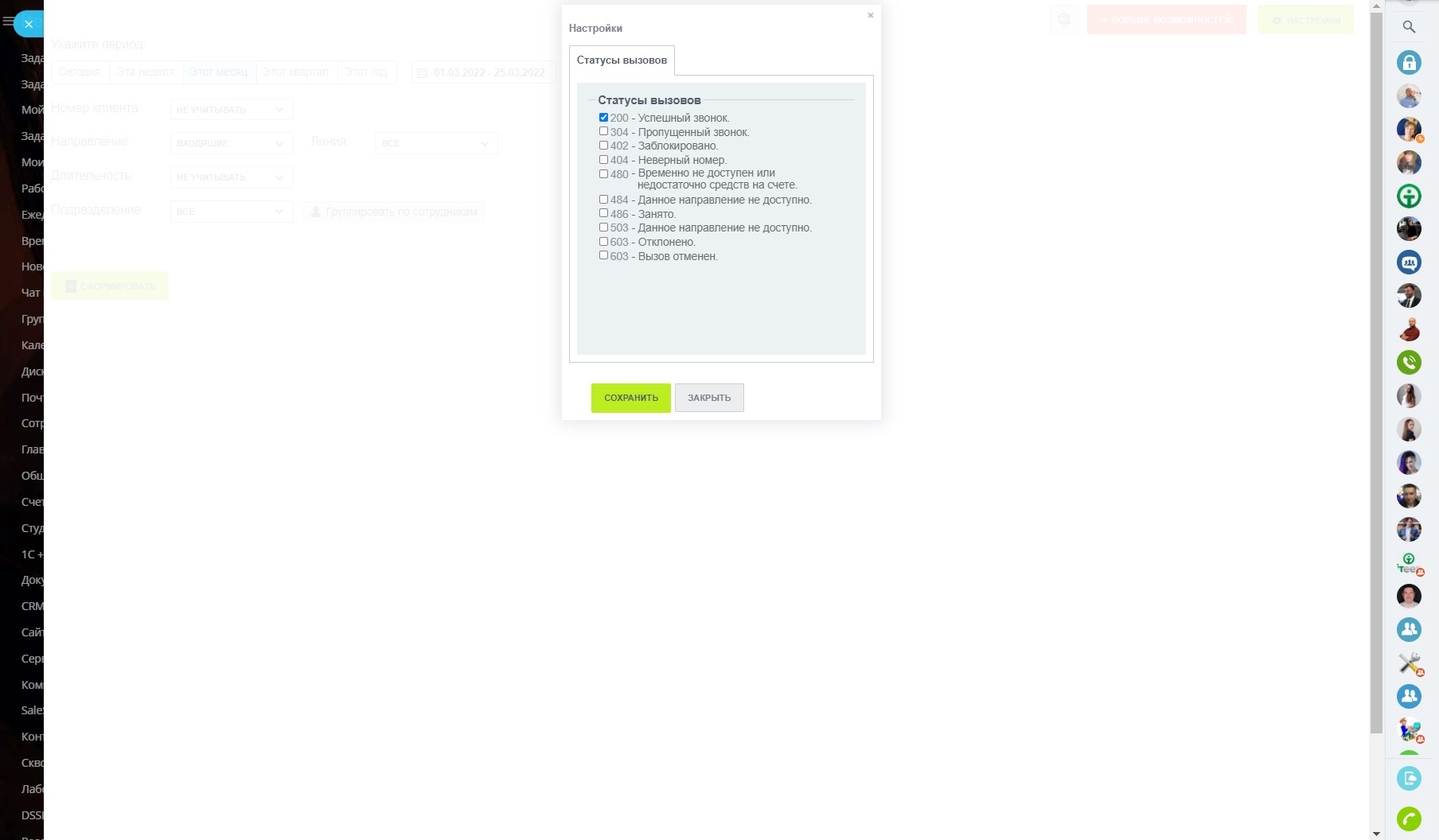В этом окне производится выбор статусов вызовов вызовов. Эти данные учитываются при формировании отчётов.