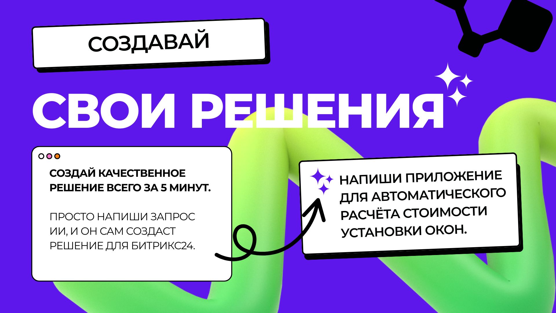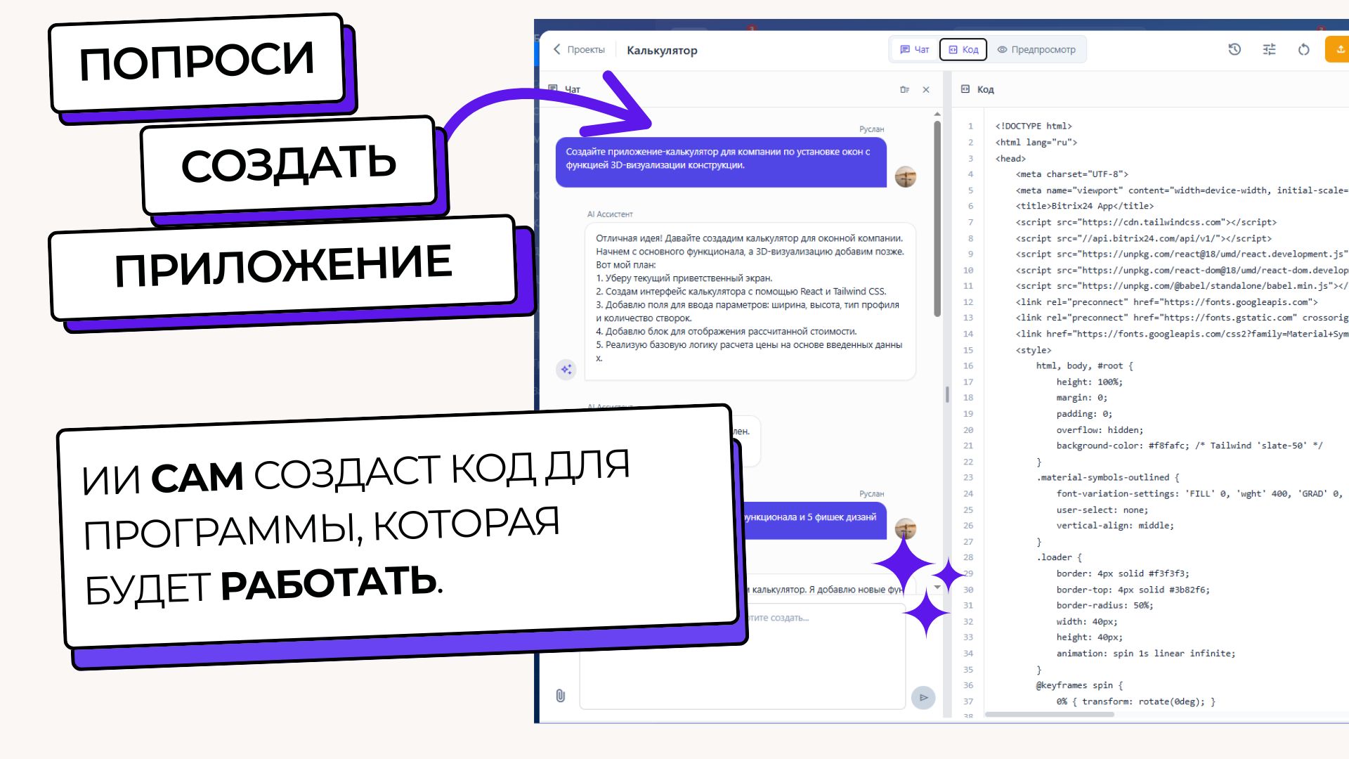 Создавайте кастомные приложения любой сложности для Битрикс24 всего за 5 минут, просто общаясь с AI. Больше не нужно быть программистом, чтобы автоматизировать бизнес-процессы и создавать уникальные решения.