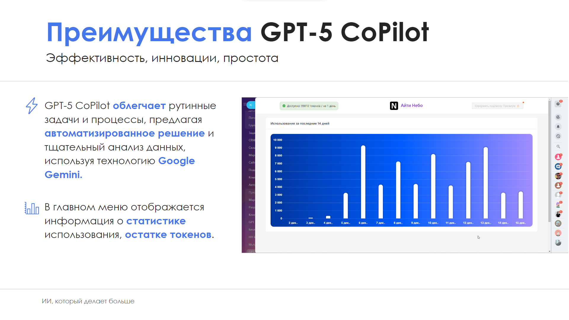 • Простота Использования: Интуитивно понятный интерфейс с доступом к статистике использования и остатку токенов.
