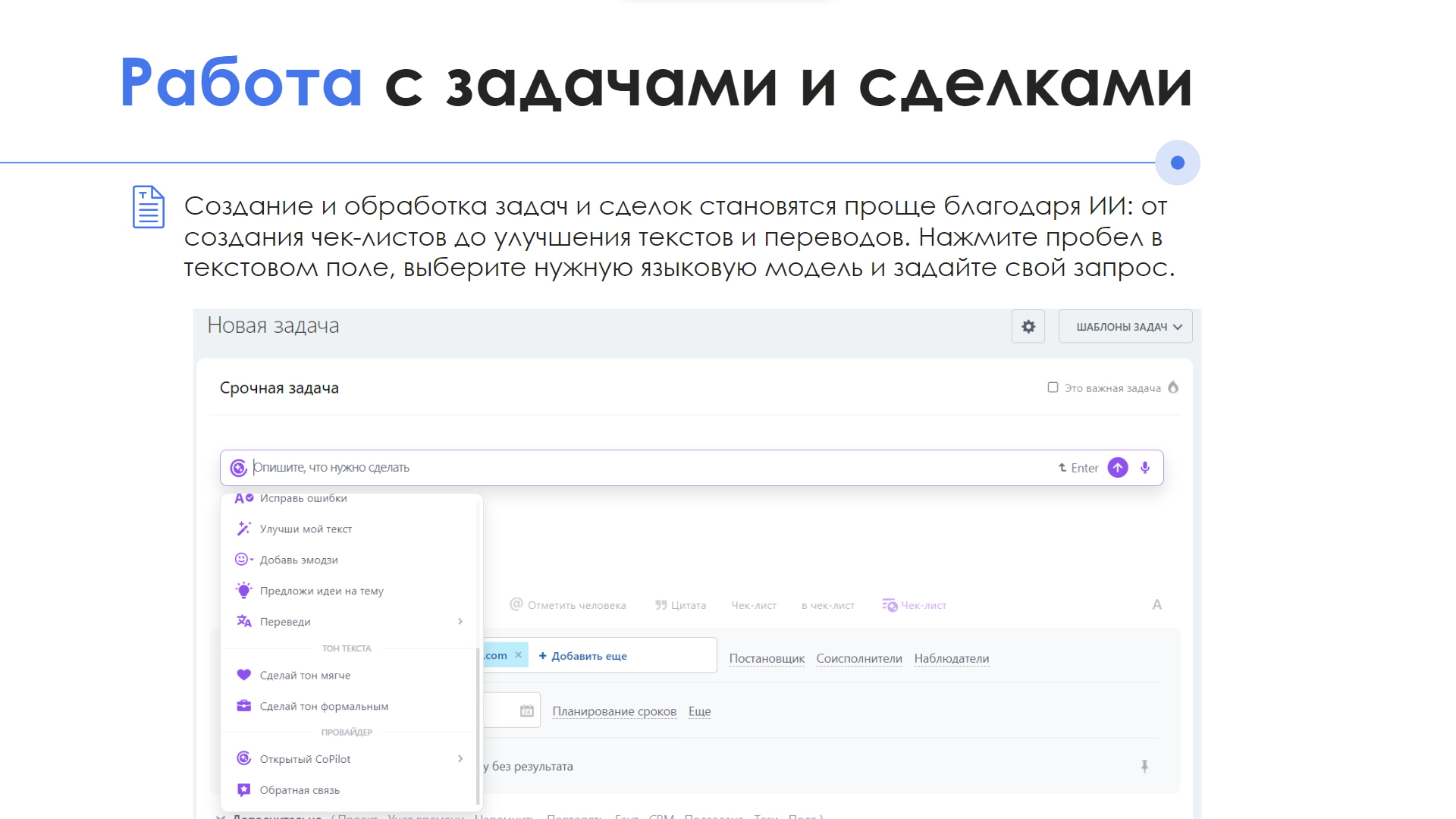 • Задачи и Сделки: Используйте ИИ для создания, обработки и улучшения текстов задач и сделок. Введите запрос в текстовое поле, выберите подходящую модель и направление работы.