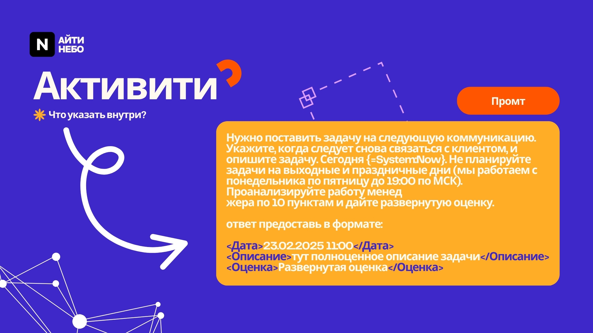 Давайте разберем конкретный пример: попросим ИИ проанализировать последний звонок и назначить дело на следующую коммуникацию. Он должен сам определить когда нужно провести следующую коммуникацию и сам написать тему общения.