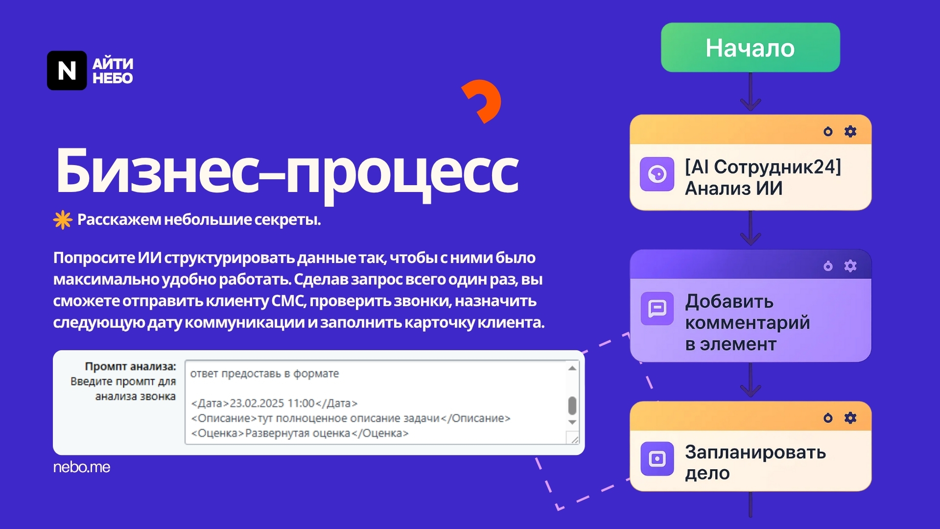 AI Сотрудник24 — умный ассистент для Битрикс24. Анализирует звонки, управляет задачами, автоматизирует процессы. AI-решение для повышения эффективности продаж и работы с клиентами. Интеграция через API, безопасность данных гарантирована. GPT / AI / ИИ