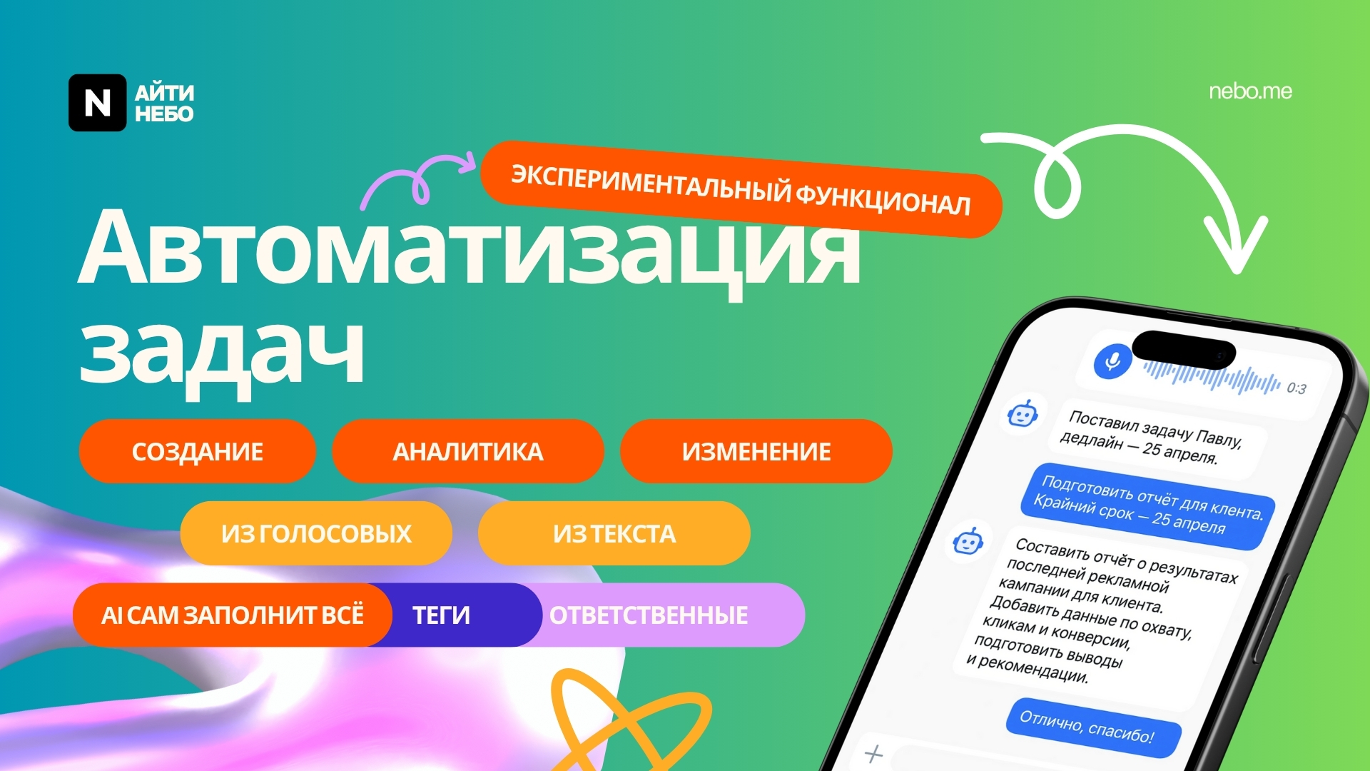 Наш инновационный продукт, который покажет вам как возможно работать с задачами по-новому, вы можете написать задачу или задачи для ИИ, он сам их полноценно оформит и поставит. Только представьте сколько времени это вам будет экономить, вы просто описываете задачу - ИИ делает всё сам. Назначает крайний срок, установить наблюдателя, ответственного, соисполнителя.