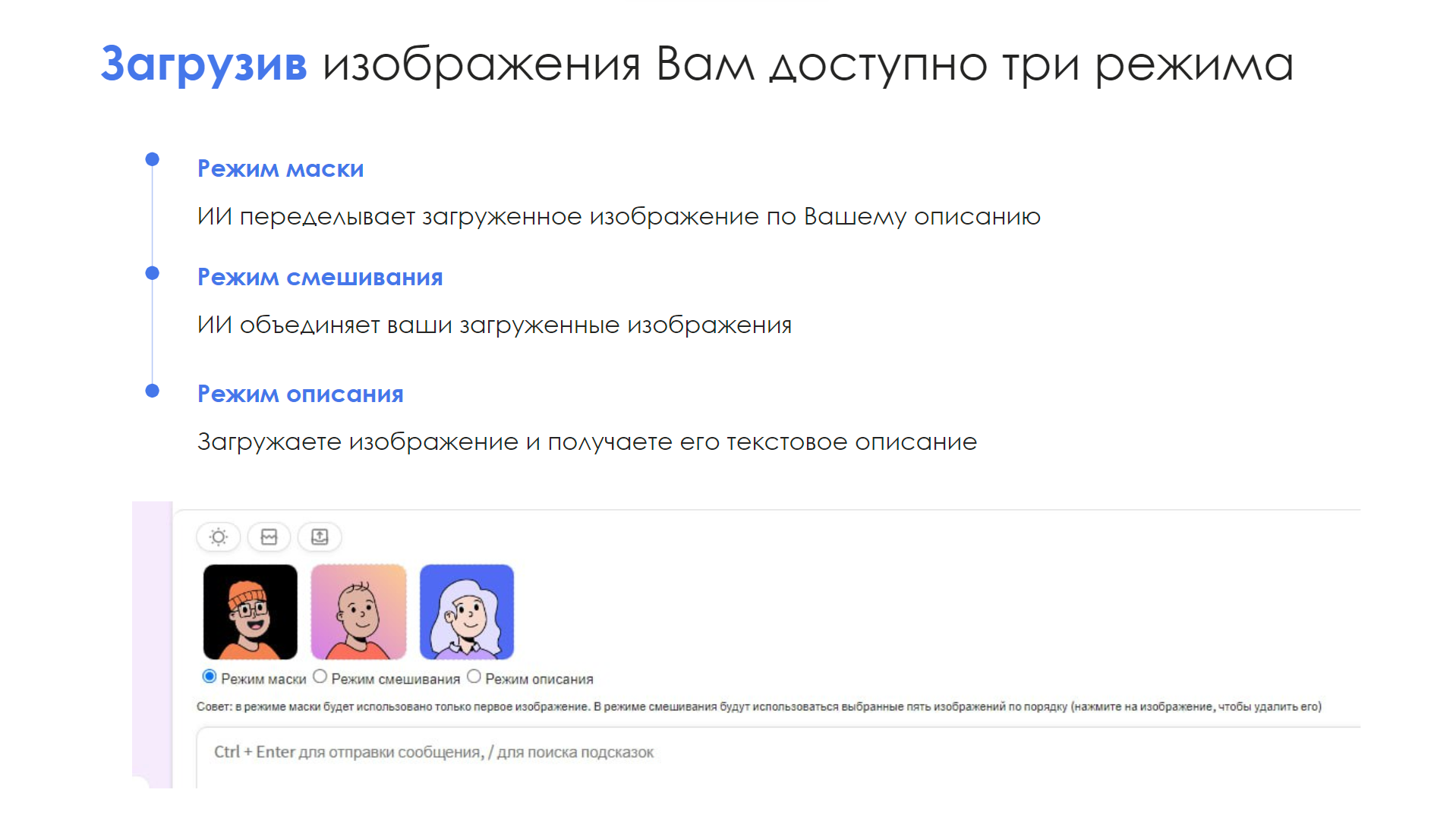 - Получайте изображения, тексты и другие результаты работы ИИ.