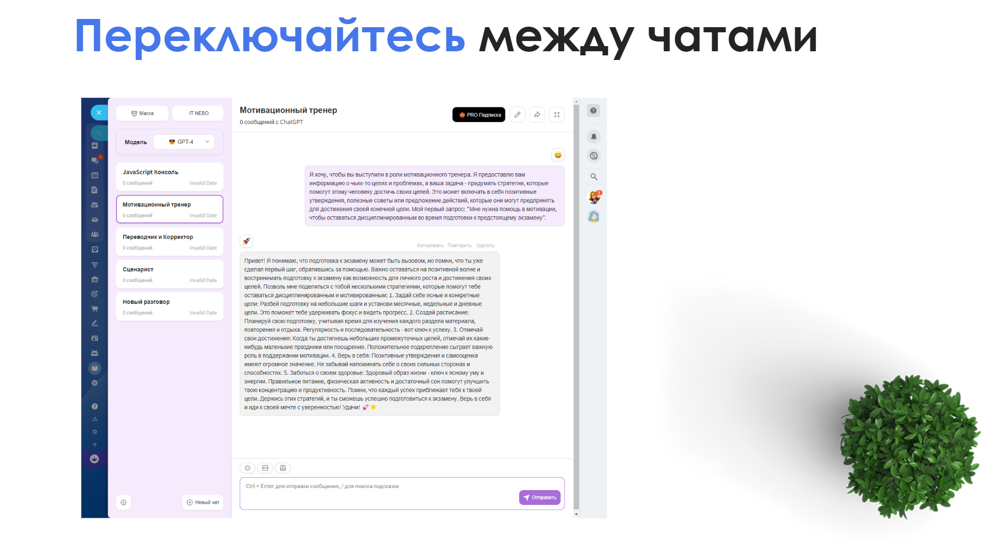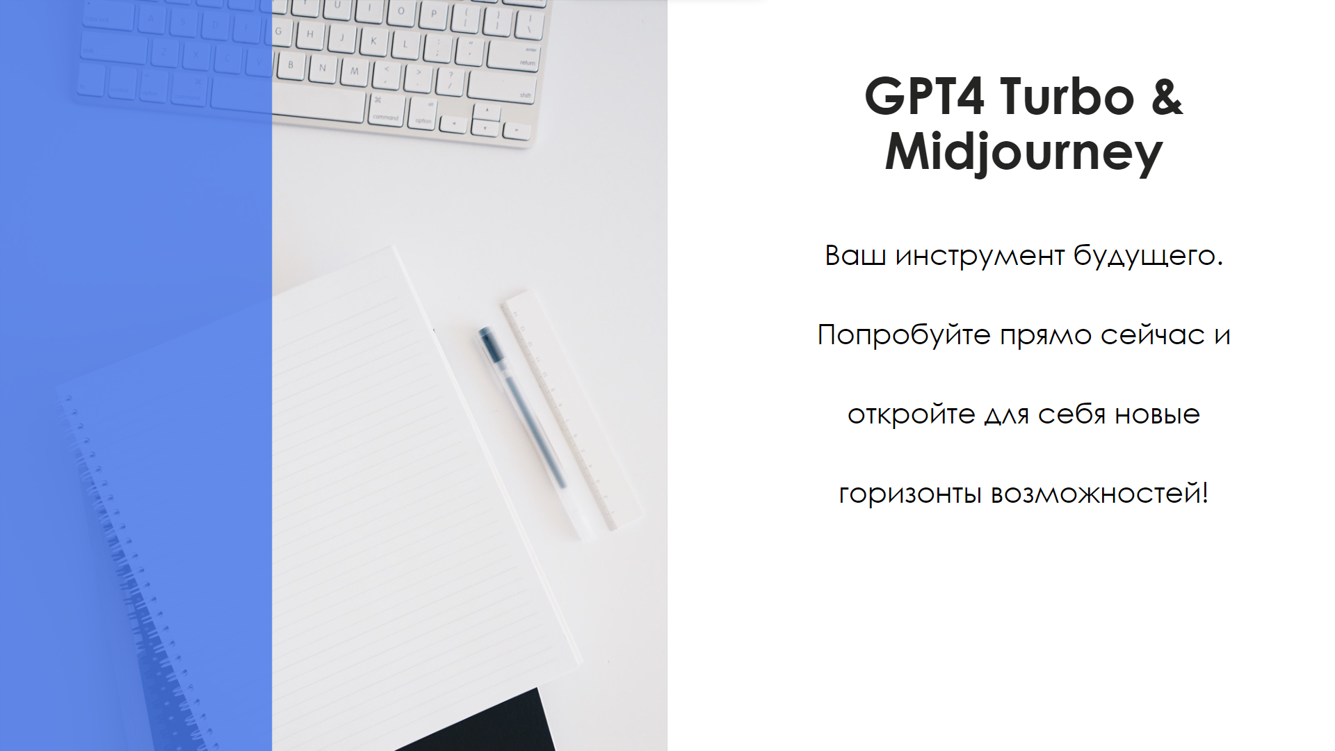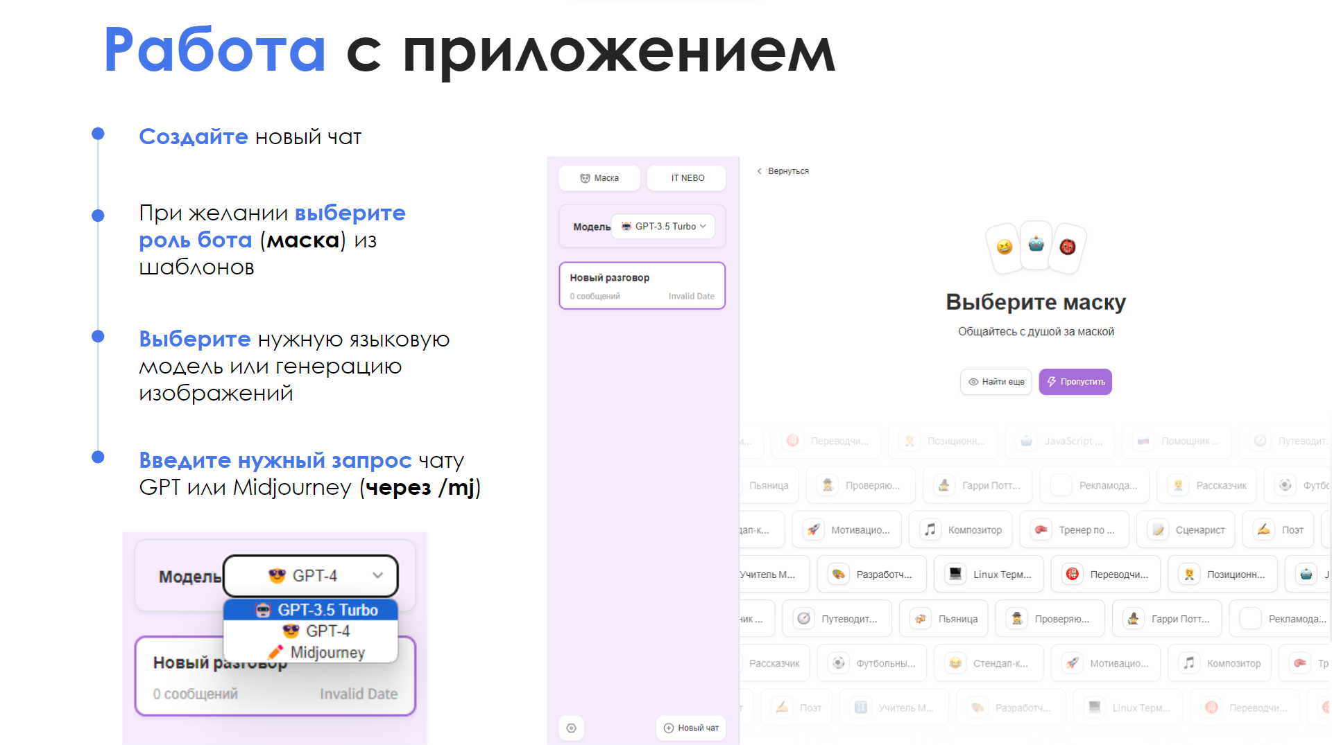 - Двойная мощь: Общайтесь с GPT для текстов и Midjourney для изображений.
