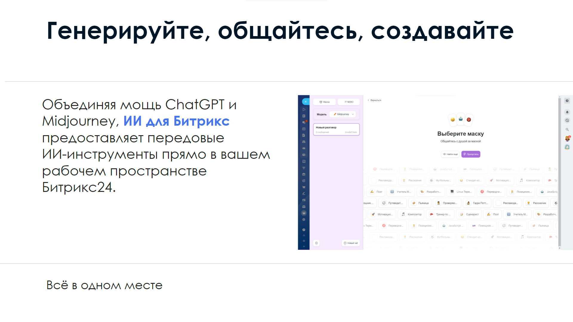 GPT4 Turbo & Midjourney для Битрикс24 открывает новые горизонты для вашего бизнеса, предоставляя мощные инструменты ИИ для улучшения эффективности и креативности вашей работы.