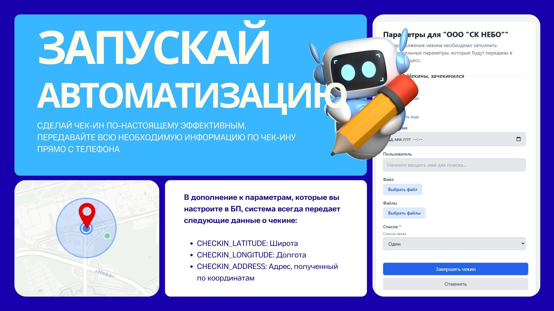 Запуск бизнес-процессов: Сделайте чекин не просто отметкой, а триггером для дальнейших действий. После успешного визита приложение может автоматически запустить любой настроенный вами бизнес-процесс.