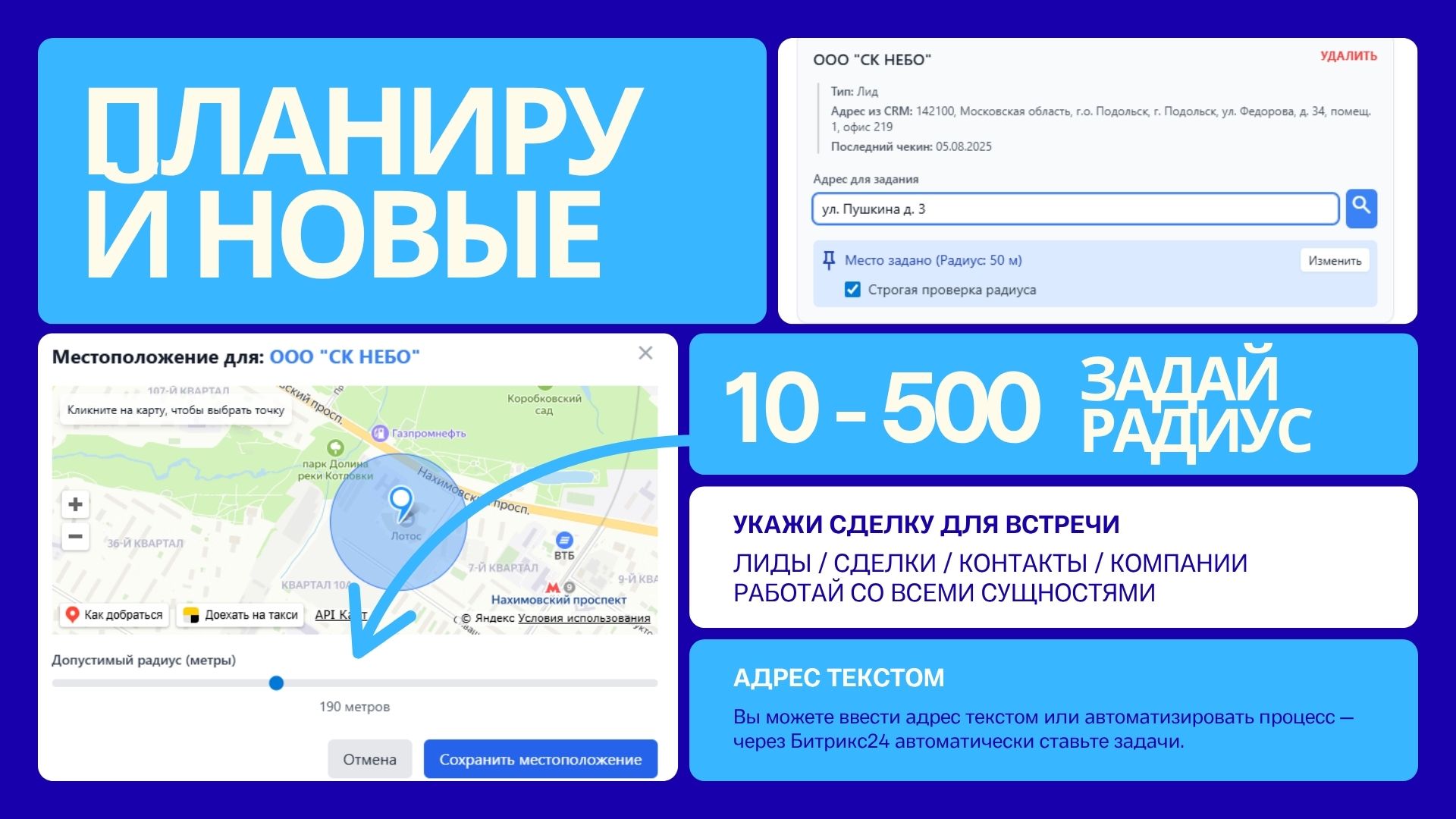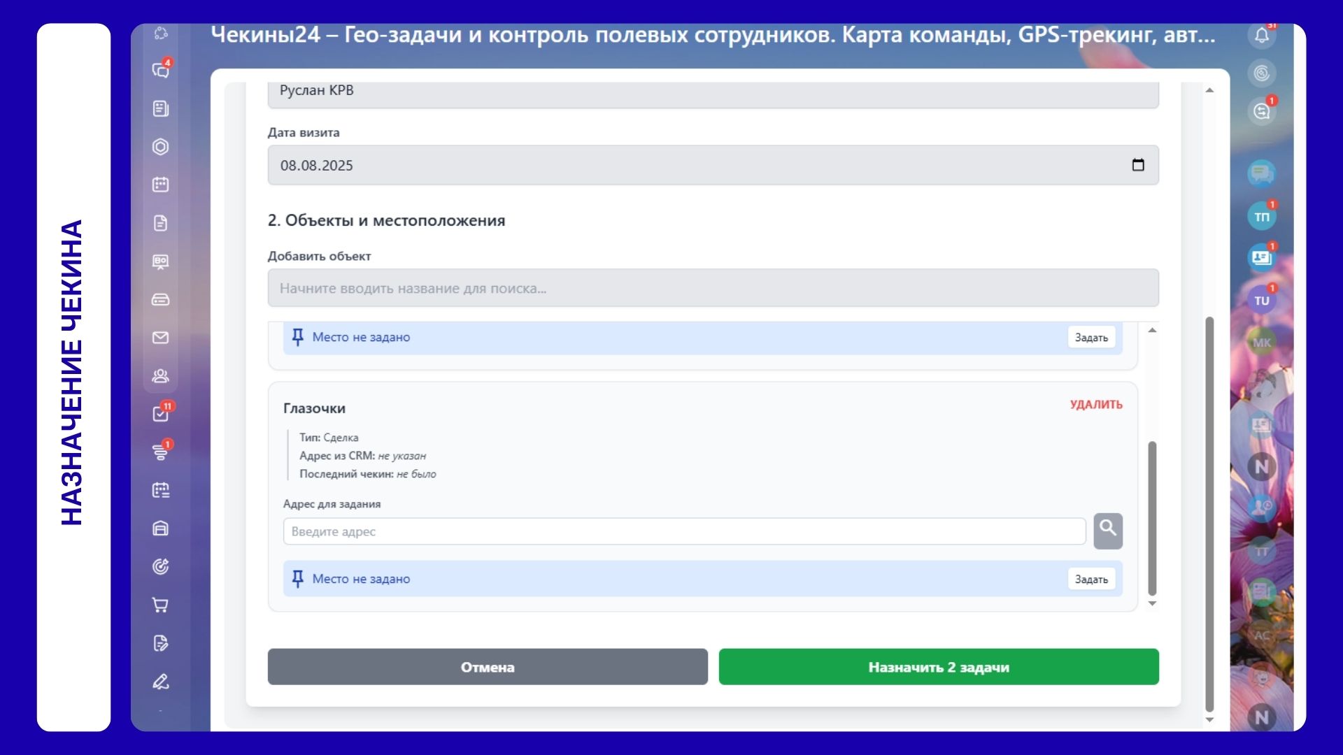 Назначайте гео-задачи: Создавайте задачи-чекины для сотрудников на любую дату. Привязывайте визиты к любым сущностям CRM — Сделкам, Лидам, Контактам или Компаниям.