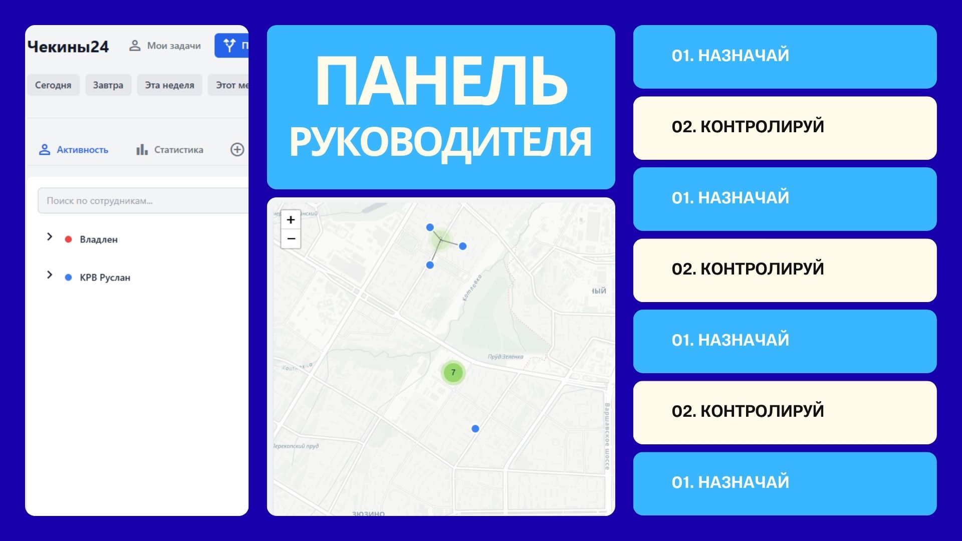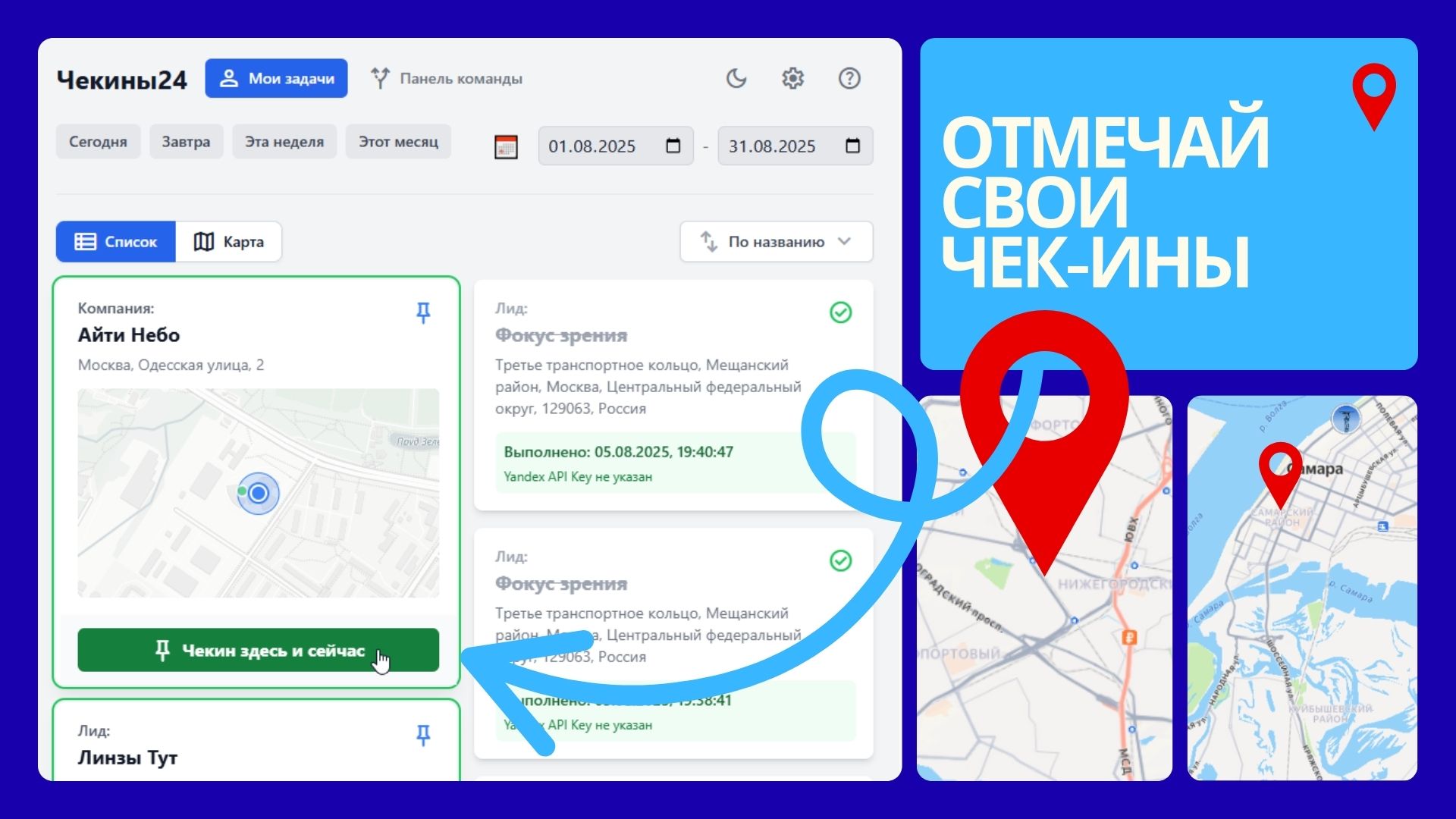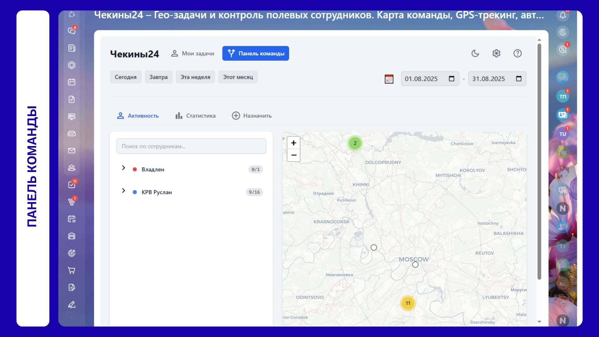 Чекины24 – Гео-задачи и контроль полевых сотрудников. Карта команды, GPS-трекинг, автоматизация по чекину