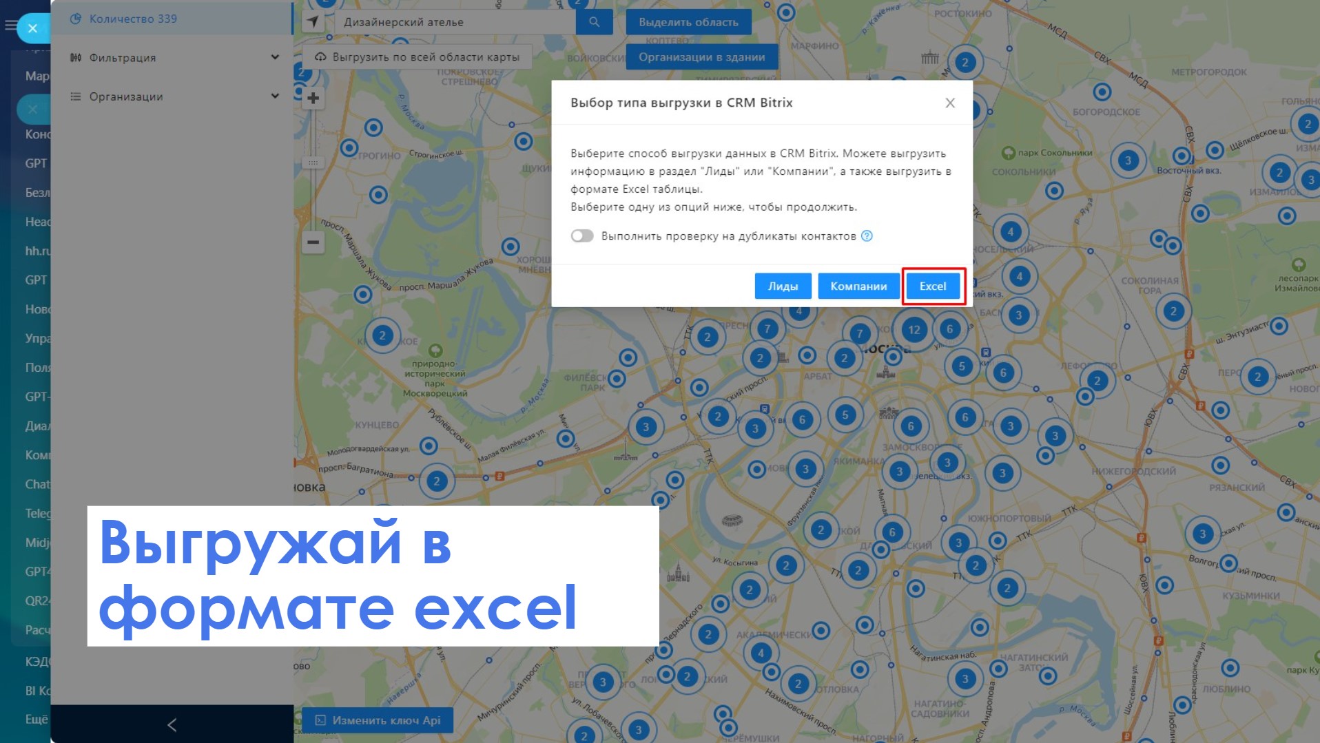 - Шаг 7: Выгрузка данных: Нажмите на кнопку "Выгрузить по всей области карты" или "Выгрузить по выделенной области", чтобы начать процесс выгрузки. Это позволит вам перенести собранные данные прямо в вашу CRM-систему.