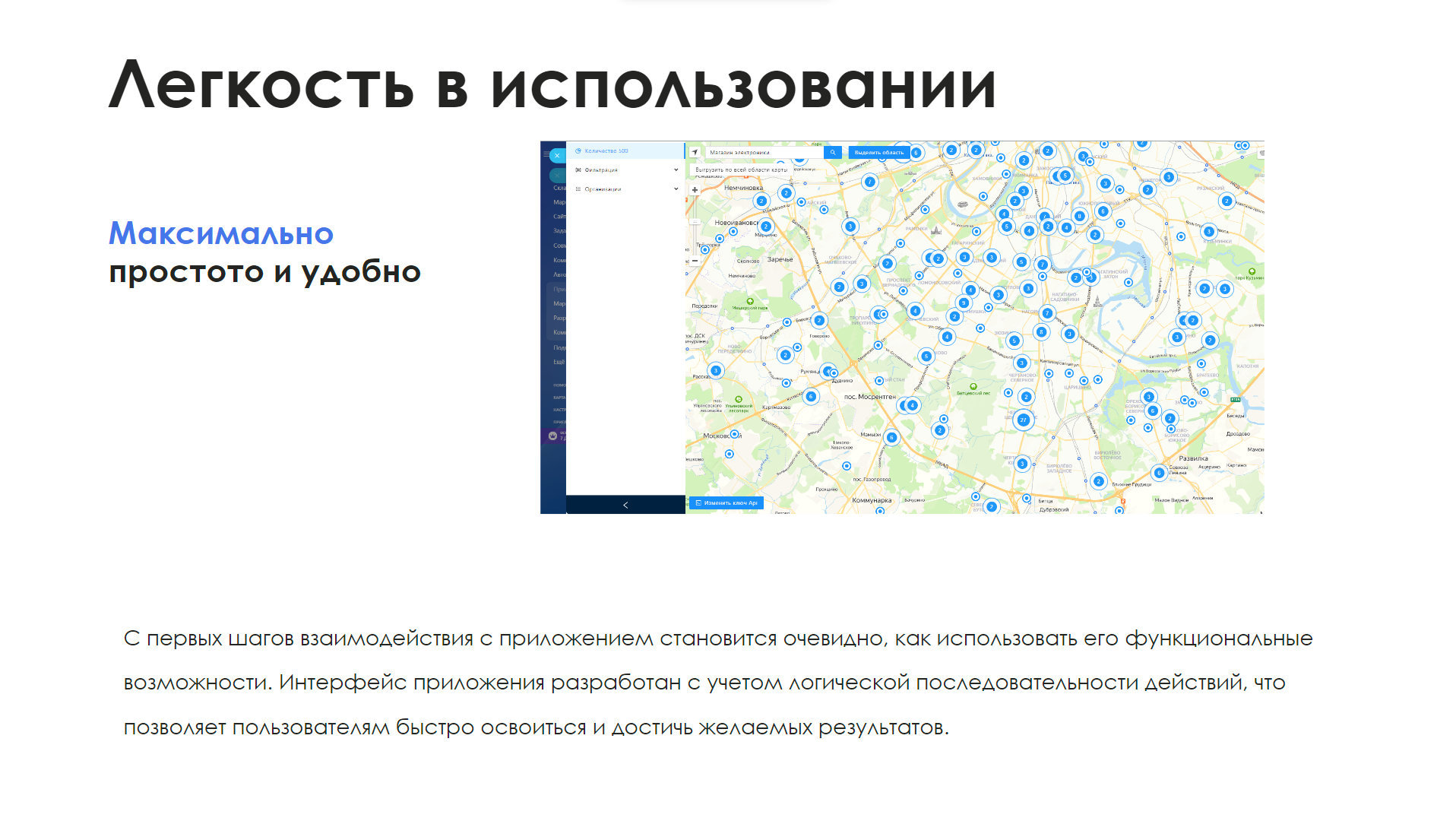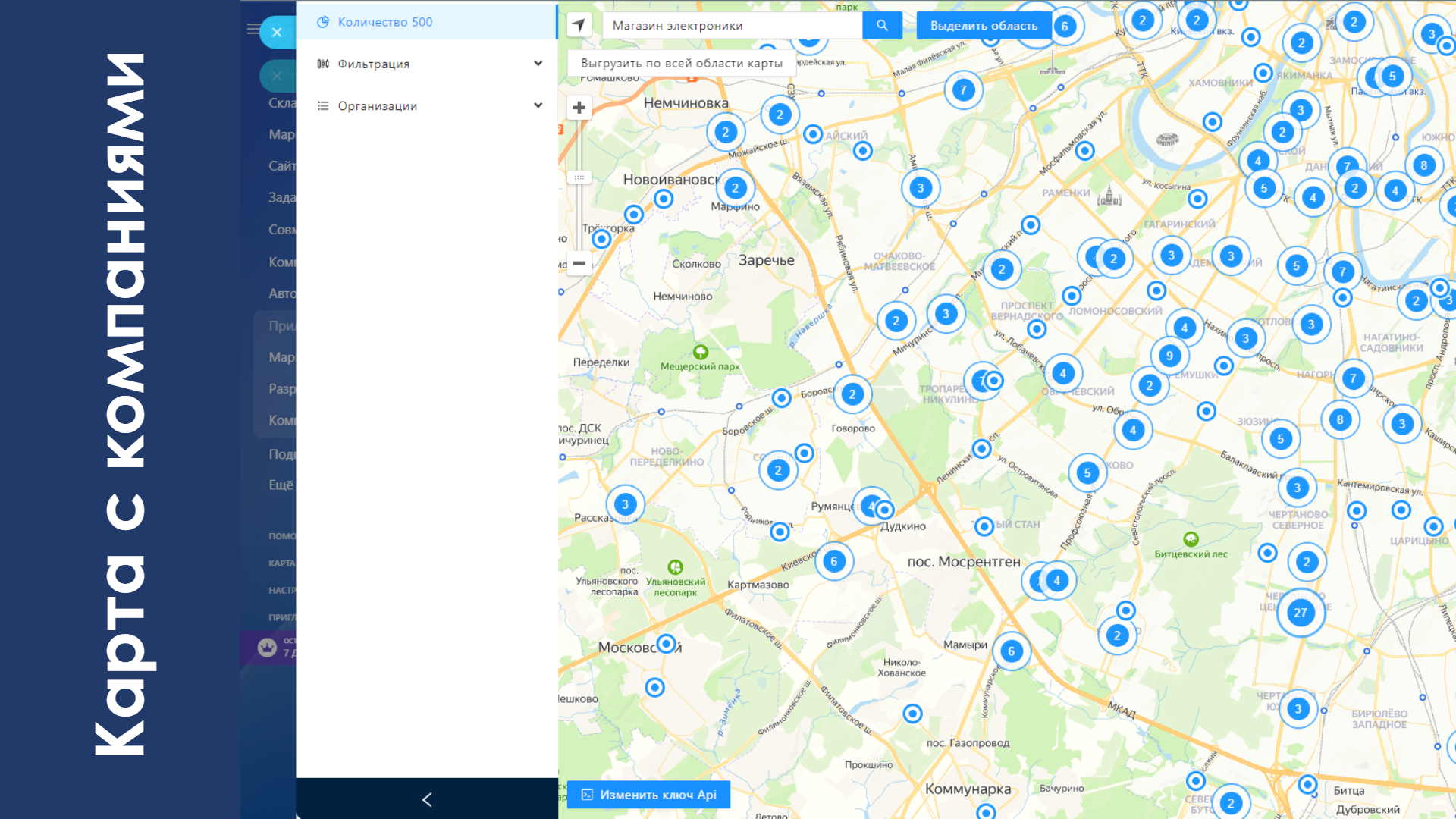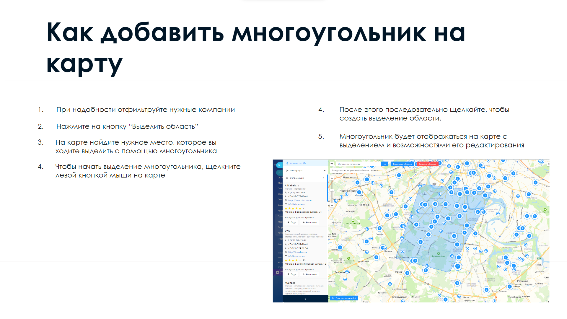 - Пользователи могут выделять интересующие области на карте для выгрузки данных о компаниях, расположенных в этих зонах.
