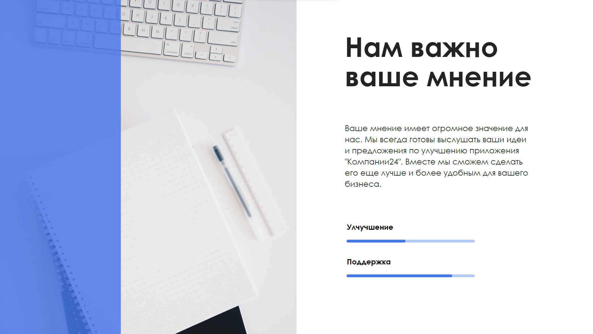 Мы ценим ваше мнение и открыты к предложениям по улучшению приложения "Компании24". Ваше мнение поможет нам сделать приложение еще лучше и более удобным для вашего бизнеса. Обращайтесь к нам по любым вопросам.