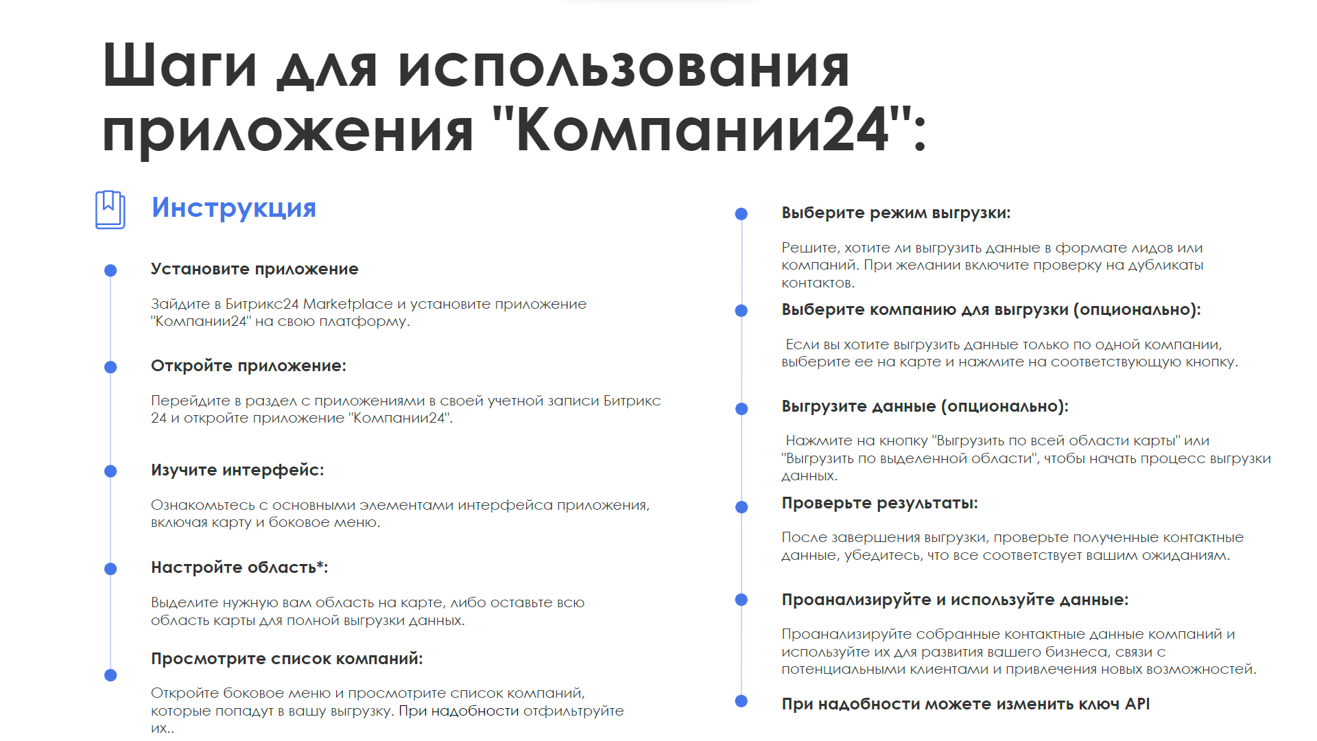 Компании24 предлагает уникальное решение для автоматической выгрузки данных о компаниях с Яндекс.Карт прямо в вашу CRM-систему Битрикс24, значительно повышая эффективность работы с потенциальными клиентами и упрощая процесс сбора и обработки коммерческой информации.