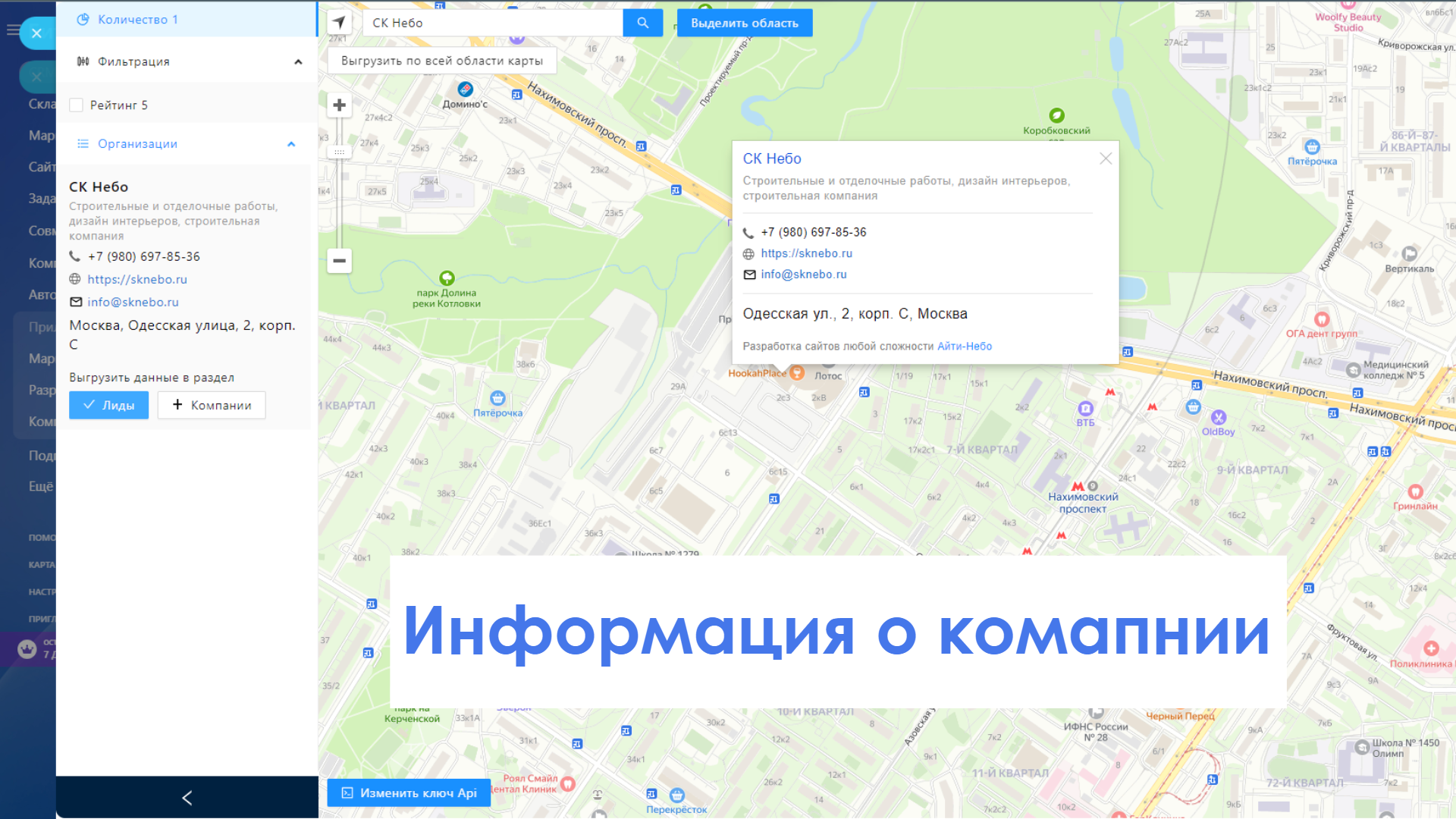 - Сбор контактной информации о компаниях возможен благодаря использованию интерактивной карты Яндекс.