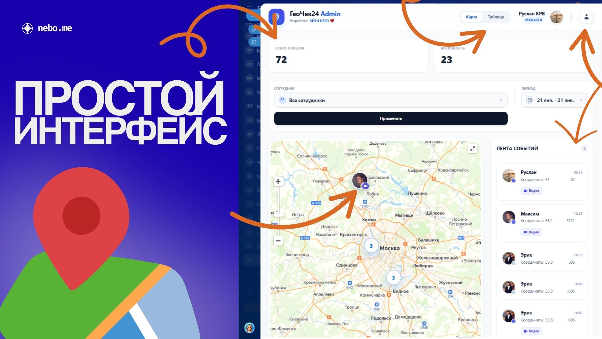 - Мгновенные чекины: Сотрудники отмечаются на карте в один клик.