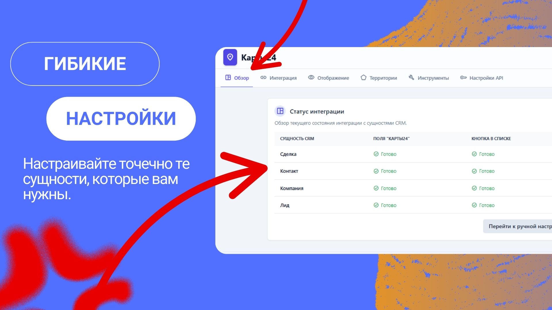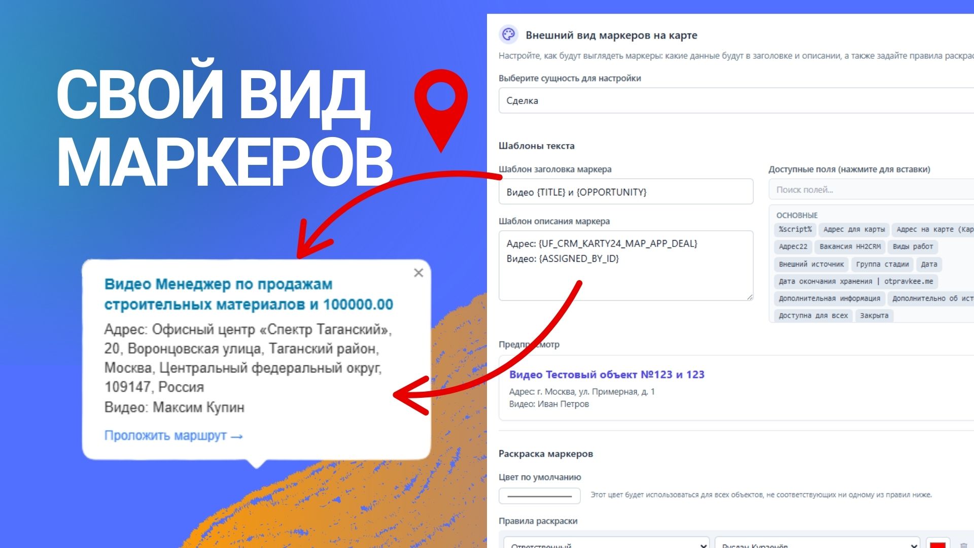 Гибкие настройки. Настройте отображение маркеров на карте, их цвет, шаблоны текста и доступные поля. Вы можете выбрать сущность для настройки: Сделка, Контакт, Компания, Лид.