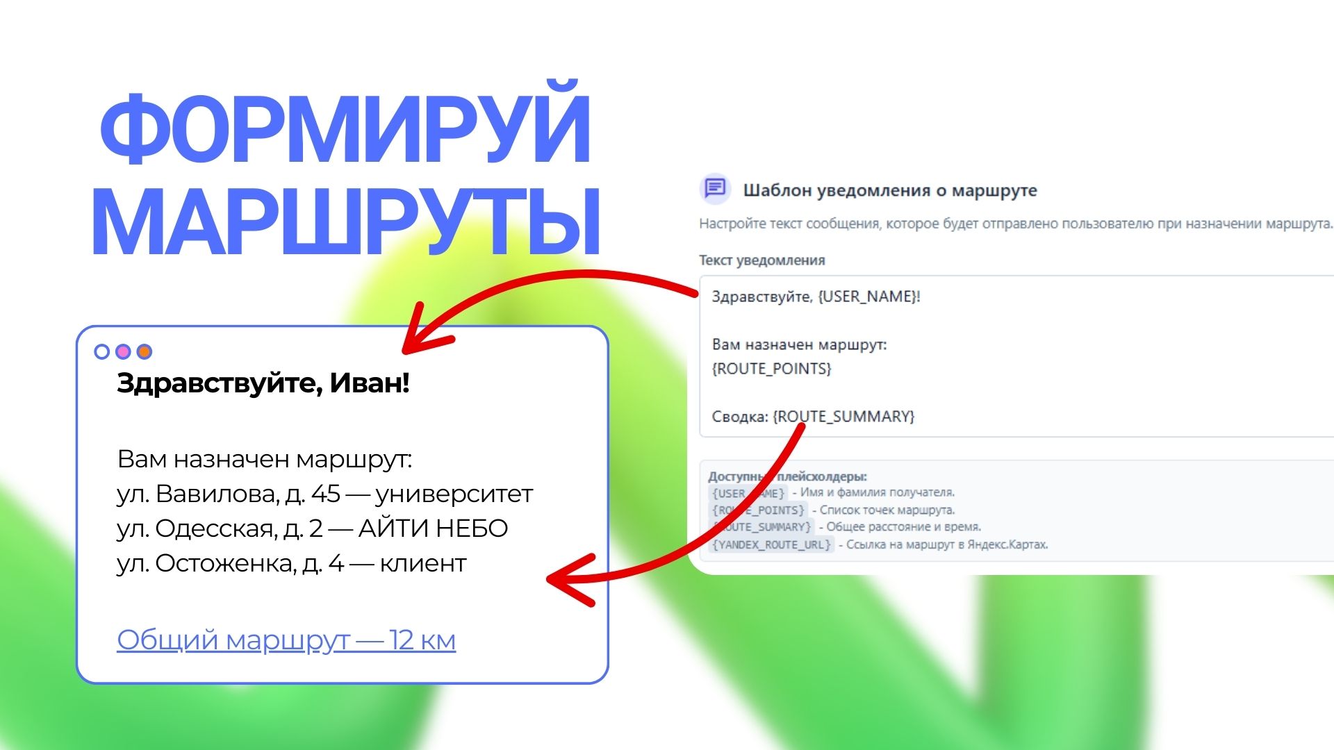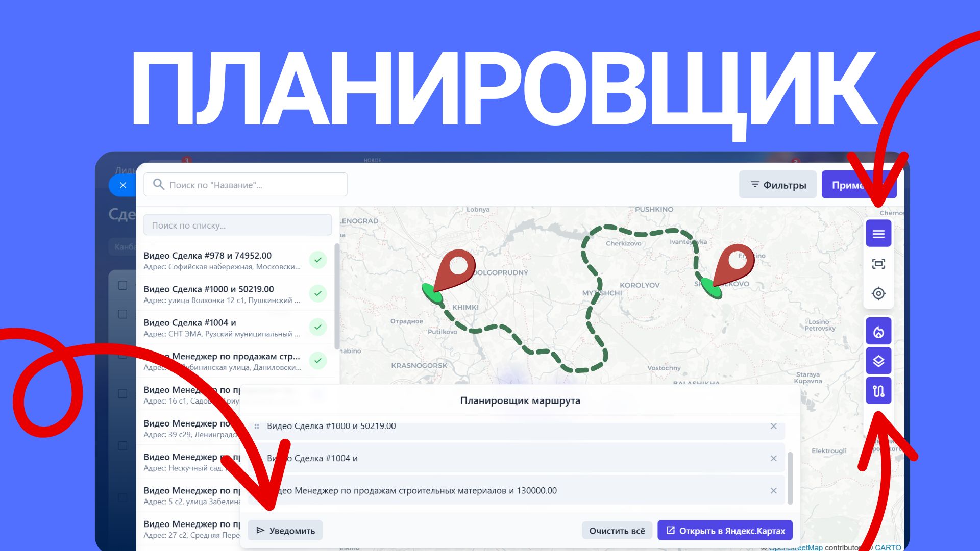 Планировщик маршрутов. Создавайте оптимальные маршруты для выездных сотрудников, чтобы экономить время и топливо.