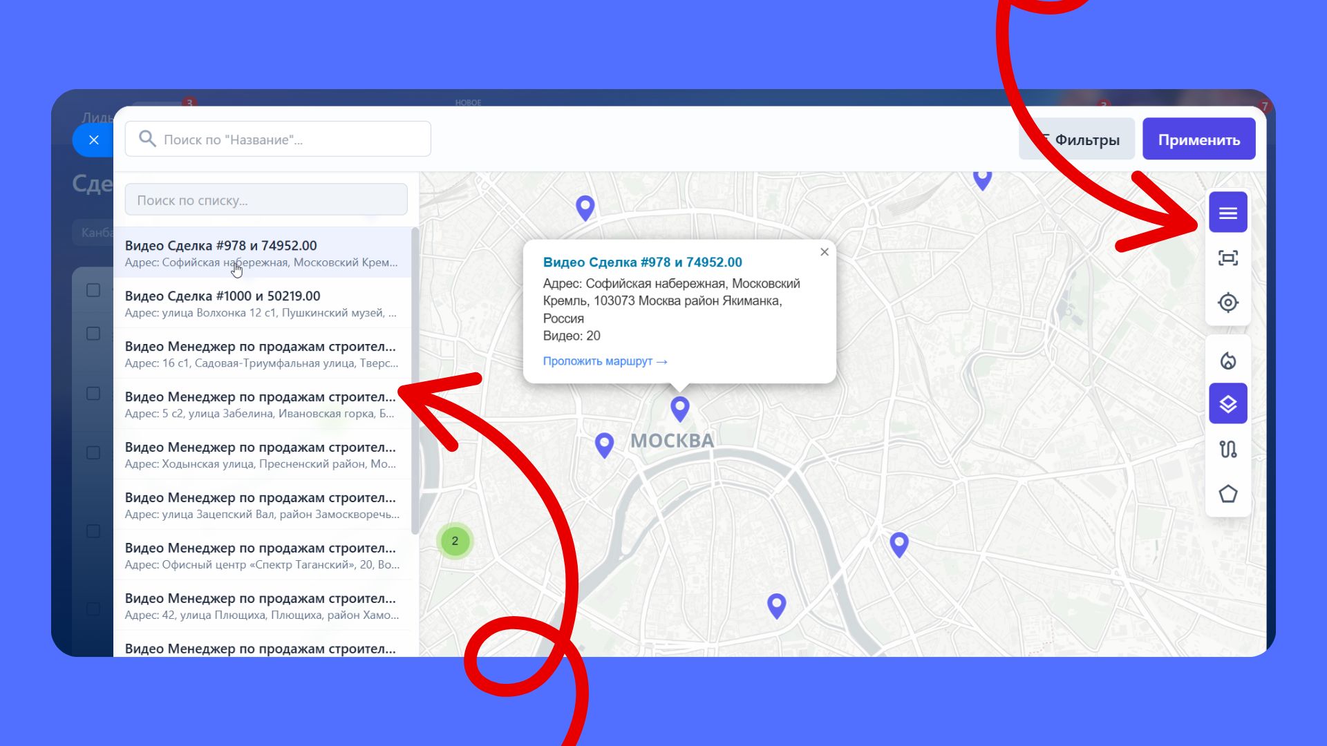 CRM на карте. Мгновенно отображайте всех ваших клиентов на интерактивной карте, чтобы видеть всю географию продаж. Вы можете видеть сделки, компании, контакты и лиды.