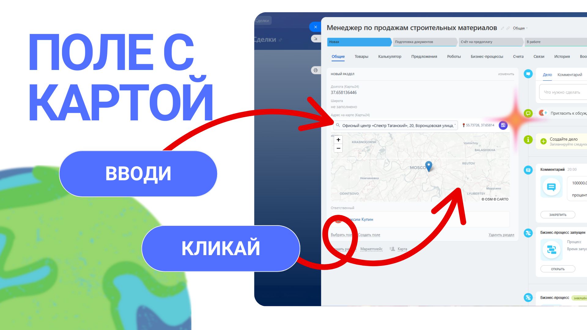 Поле с картой. Добавьте поле с картой прямо в карточку CRM, чтобы работать с адресом, не покидая сделку или контакт. Просто введите или кликните на карте, чтобы получить адрес.