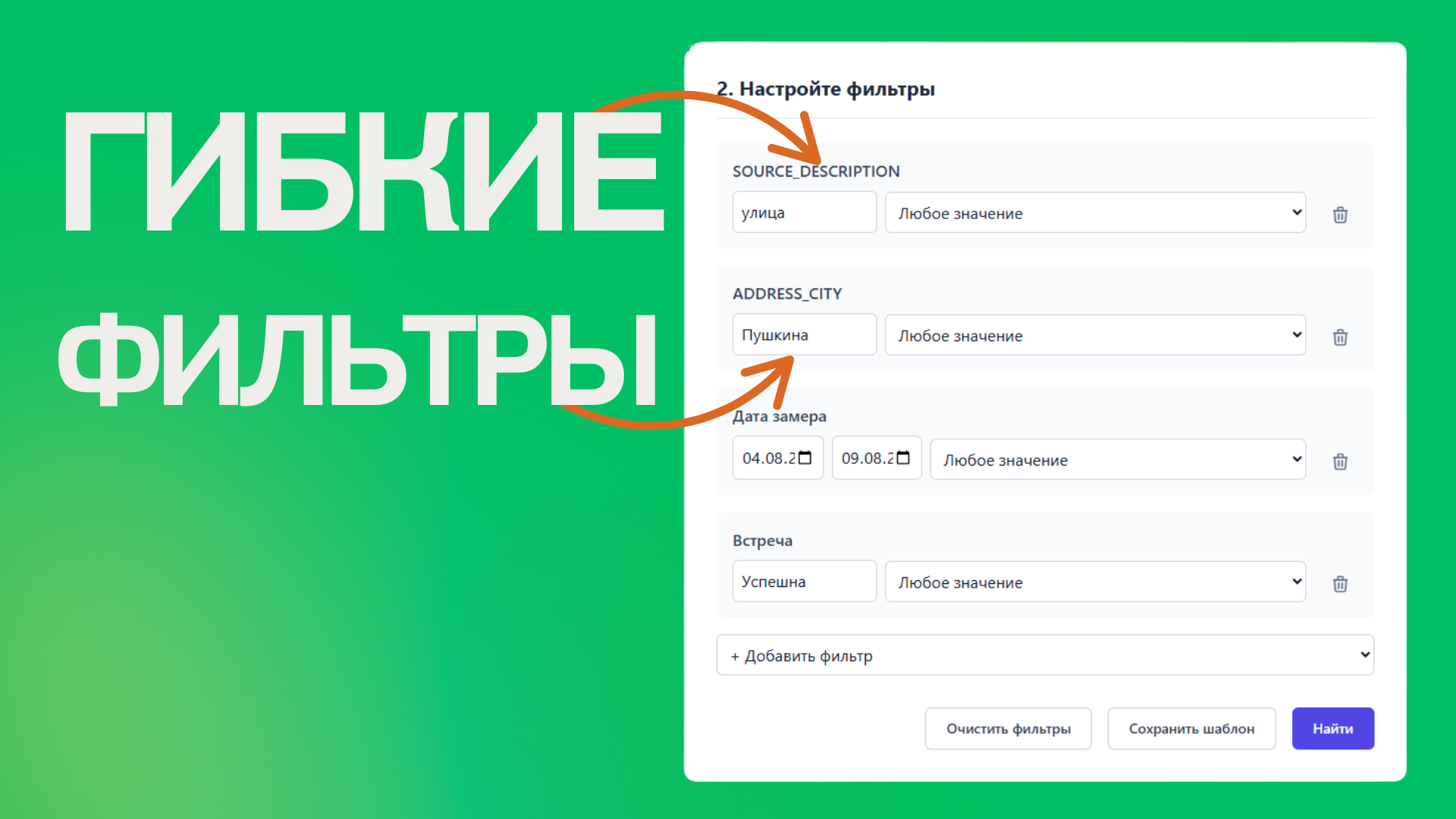 Гибкая система фильтрации Создавайте выборки любой сложности. Наш конструктор фильтров позволяет отбирать элементы по любым стандартным и пользовательским полям: по ответственному, дате создания, стадии воронки, сумме, источнику и десяткам других параметров.