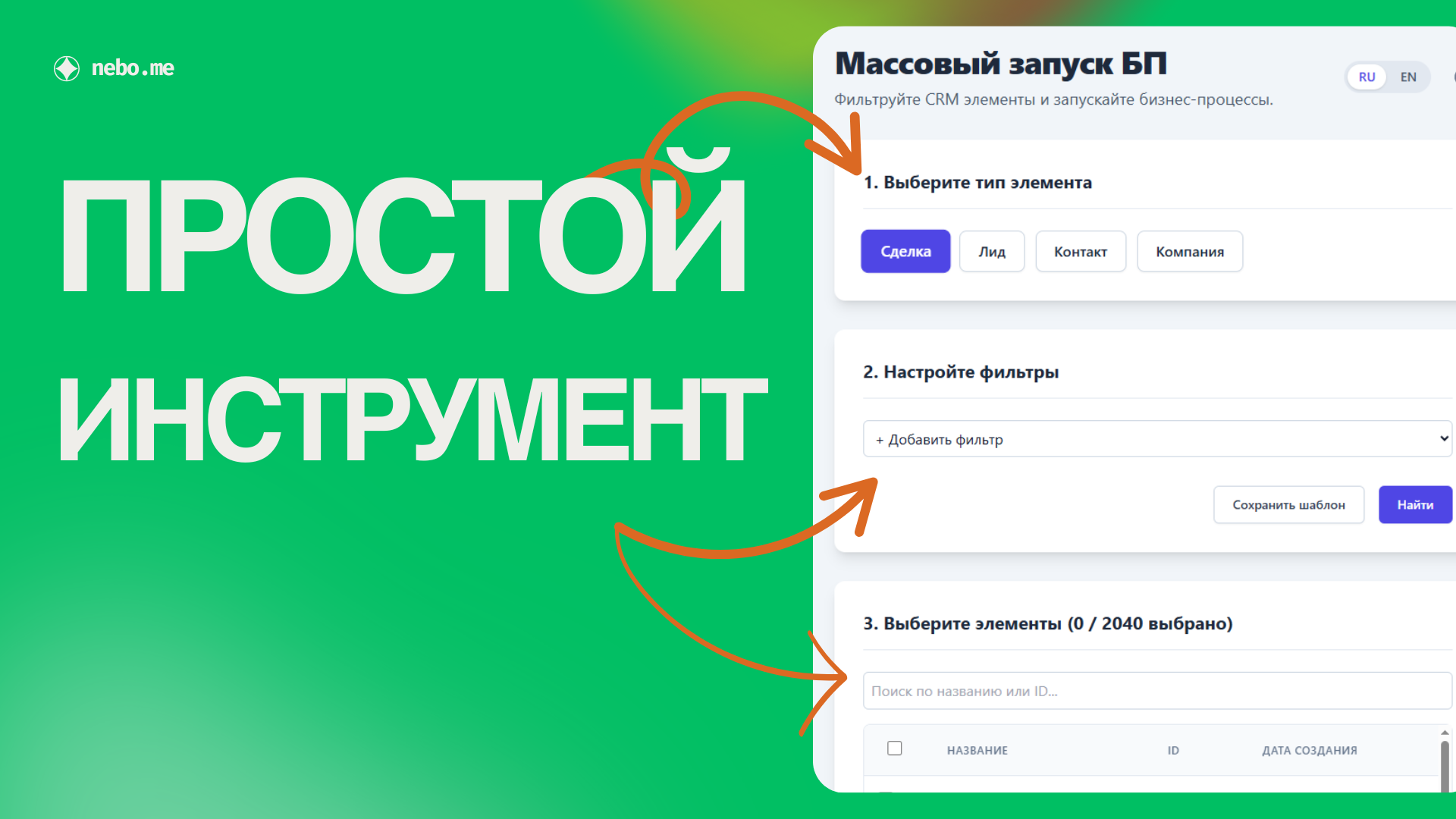 Массовый запуск БП: Автоматизируйте рутину и запускайте бизнес-процессы для тысяч CRM-элементов за один клик. Эффективность в новом масштабе!