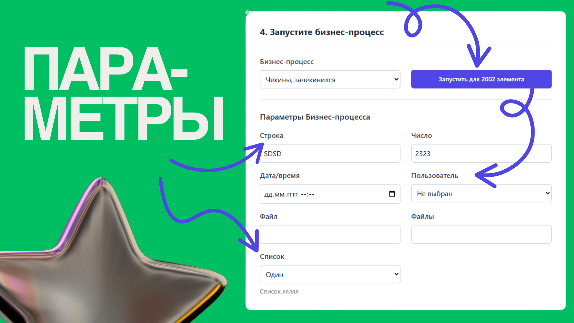 Запуск любого бизнес-процесса с параметрами Выберите один из доступных бизнес-процессов для данного типа сущности. Если ваш БП требует входных параметров (например, комментарий, дата или ответственный), вы сможете заполнить их прямо в интерфейсе приложения перед запуском.