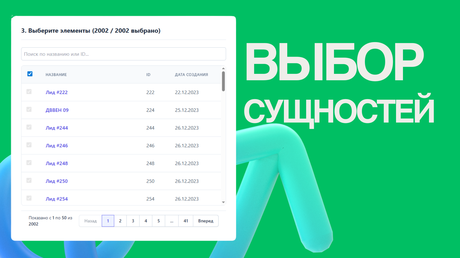 Выборка и управление элементами Приложение покажет всех, кто попал под ваш фильтр. Вы можете запустить бизнес-процесс сразу для всех найденных элементов или вручную выбрать нужные из списка. Удобный поиск и пагинация помогут быстро сориентироваться даже в тысячах записей.