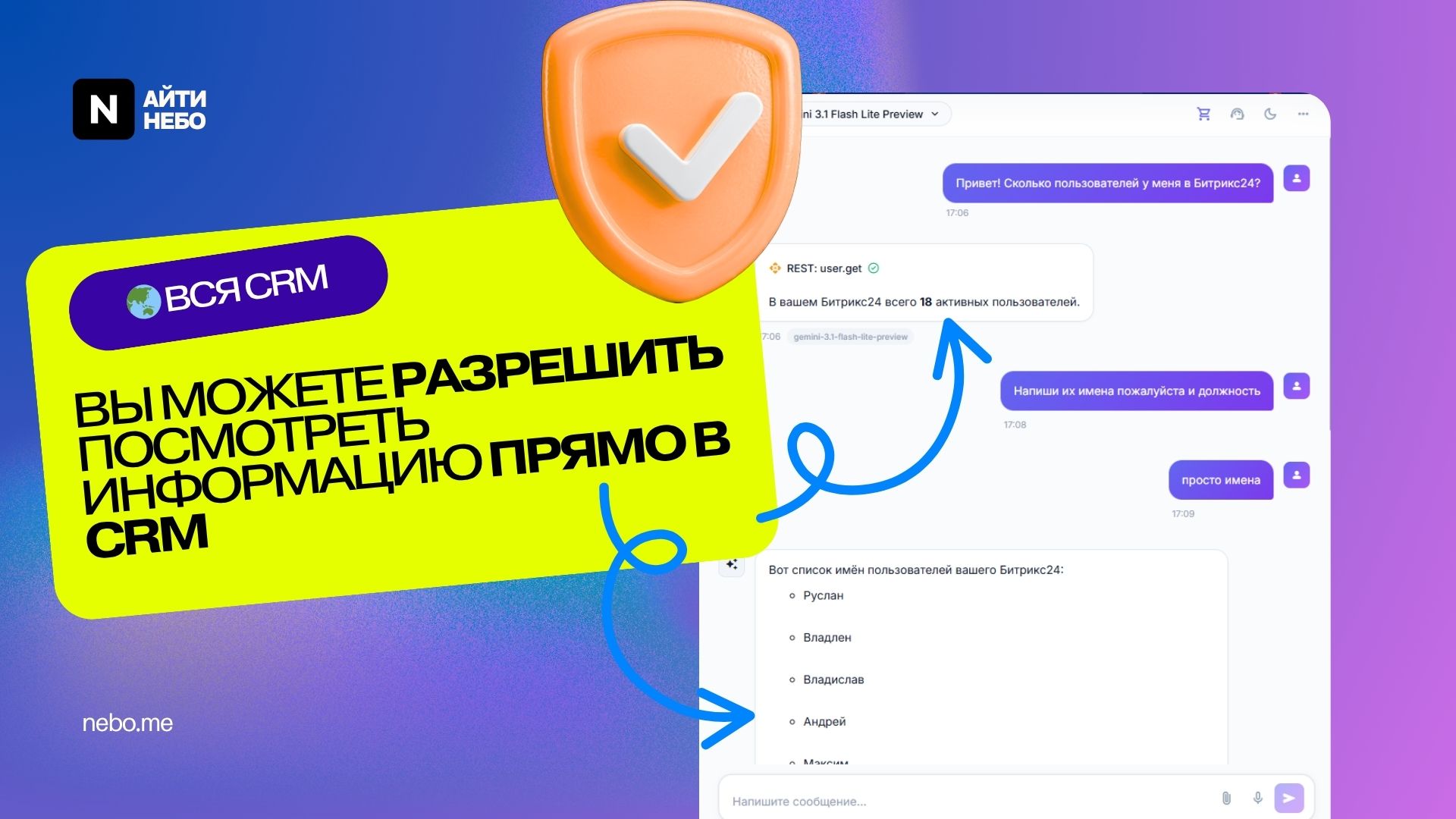 Это ваш персональный ИИ-помощник, который живёт прямо внутри CRM. Вы общаетесь с ним, как с коллегой, — а он сам находит нужные данные, вызывает REST API вашего портала и возвращает готовый результат. Без фильтров, без отчётов, без лишних кликов.