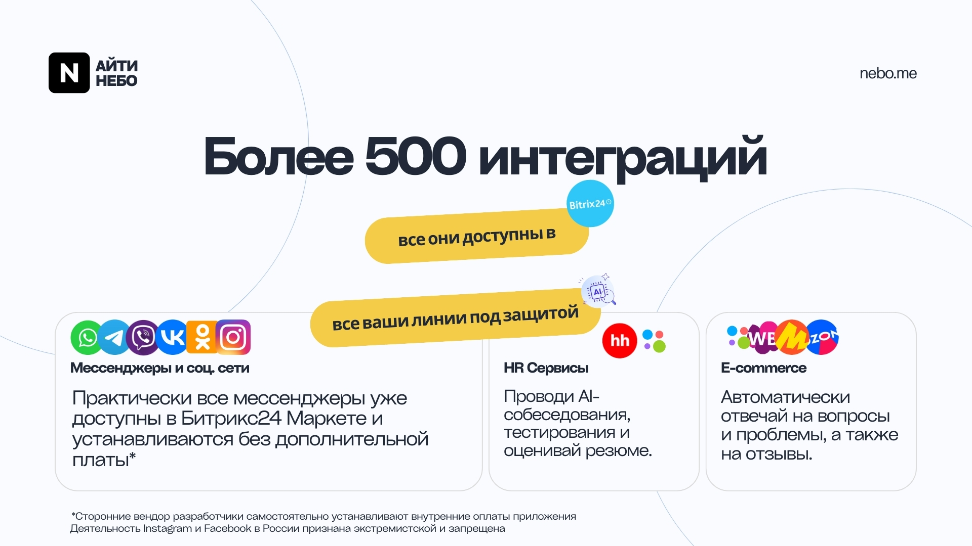 Бот поддерживает интеграцию с любыми каналами через внешние сервисы Битрикс24. Более 500 готовых интеграций, включая Telegram, WhatsApp, ВКонтакте, Avito, чаты на сайте и многое другое.
