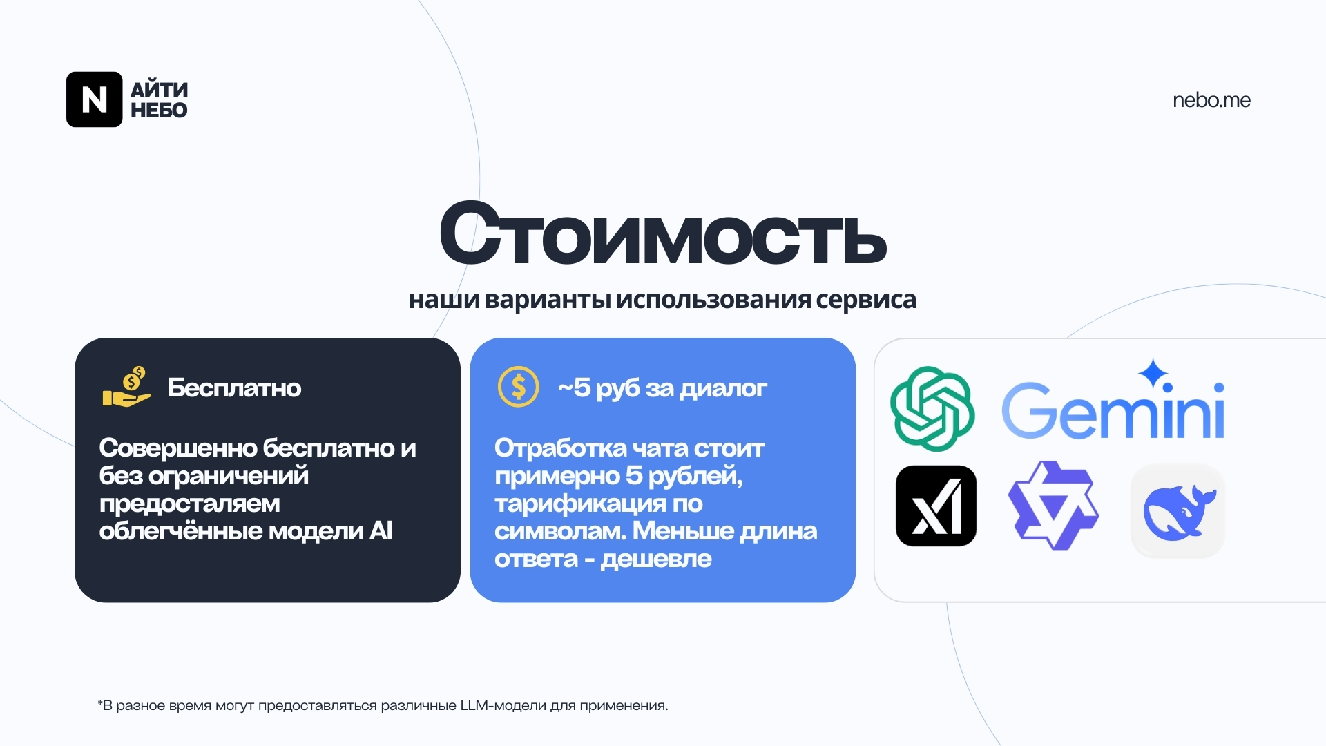 Мы поддерживаем широкий спектр моделей, включая OpenAI GPT (3.5 Turbo, 4, 4.1, 4.5 и другие), Google Gemini (1.0, 1.5), Qwen, Deepseek и другие. Список постоянно обновляется, чтобы вы могли использовать самые передовые технологии.