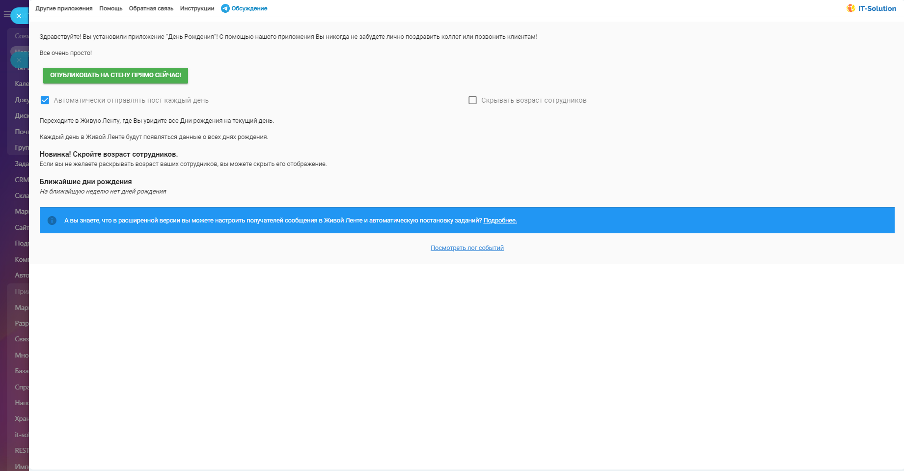 Чтобы минимизировать риск повторения неприятных ситуаций предлагаем установить приложение для Битрикс24 - День Рождения.