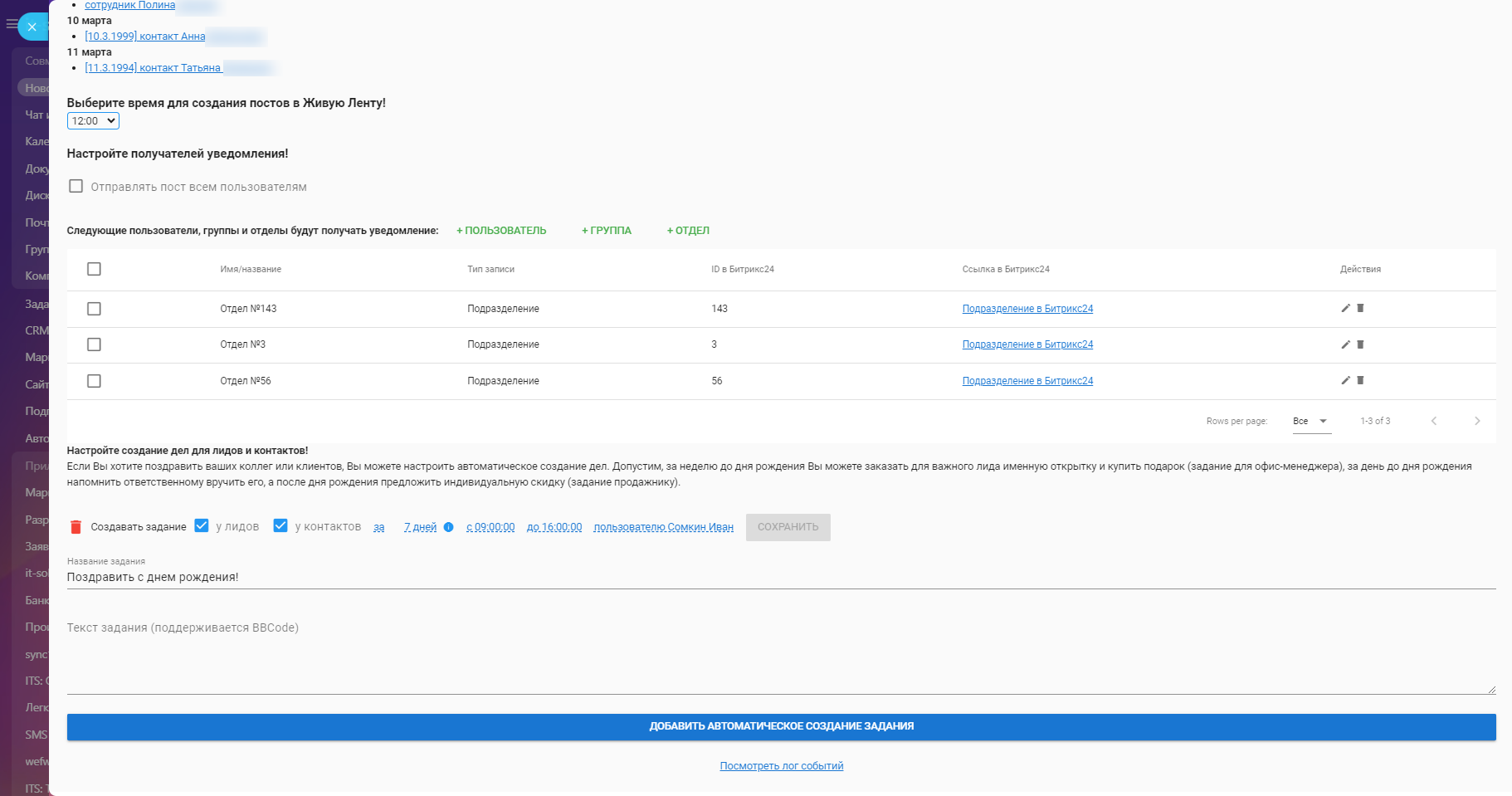 Каждую ночь приложение будет обновлять данные о днях рождения ваших сотрудников/Лидов/контактов/компаний и выставлять в виде таблицы в Живую Ленту. То есть, перед тем как начать рабочий день, Вы всегда будете знать, кого Вам надо поздравить с Днем рождения!