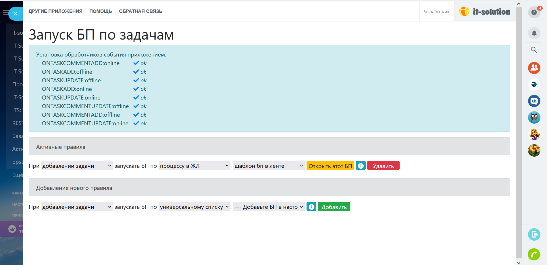 Приложение позволяет настроить запуск бизнес-процессов по созданию, редактированию задачи, а также по добавлению и редактированию комментариев к задаче. Также приложение позволяет запускать БП вручную из карточки Задачи.