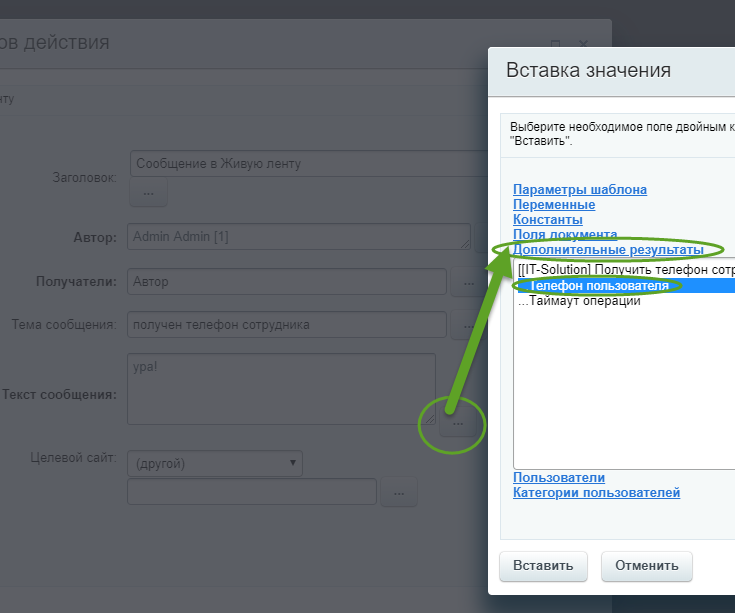 Добавляет действие в дизайнер бизнес-процессов, позволяющее получить рабочий, мобильный или внутренний телефон пользователя.
