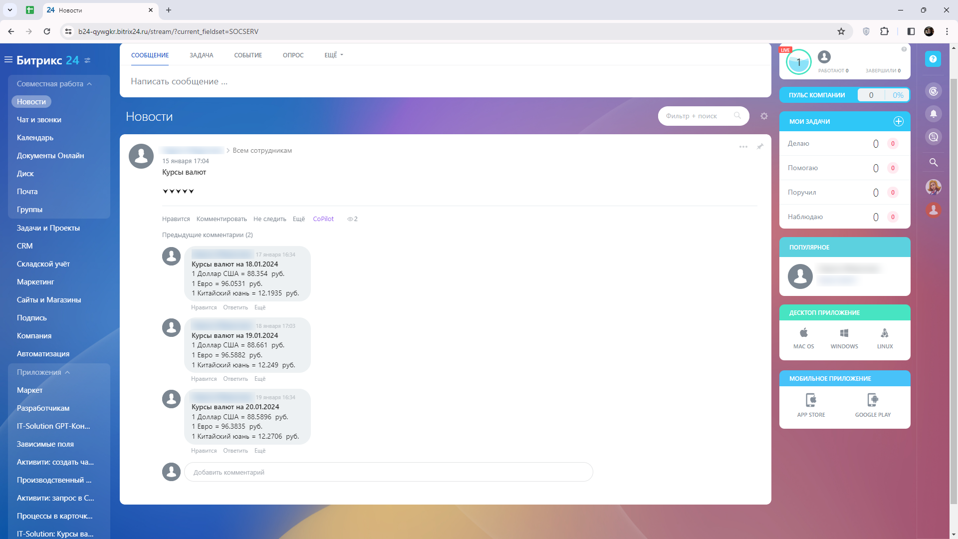 Приложение позволяет удобно отслеживать изменения курса доллара, евро и китайского юаня. После установки и настройки приложения в Живой ленте портала Битрикс24 будет создан пост с актуальным курсом валют. В дальнейшем, под данным постом будут публиковаться комментарии с текущим курсом от ЦБ РФ.