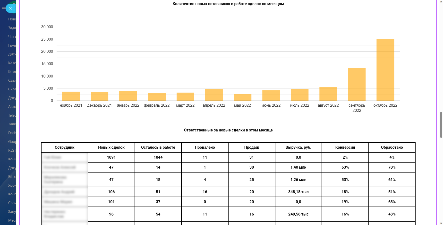 - Рейтинг ответственных за Лиды с основными показателями по новым и всем Сделкам.