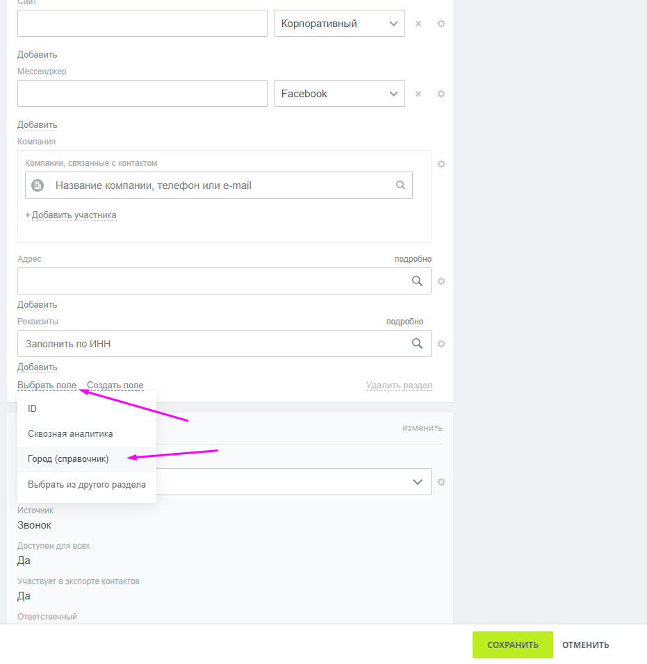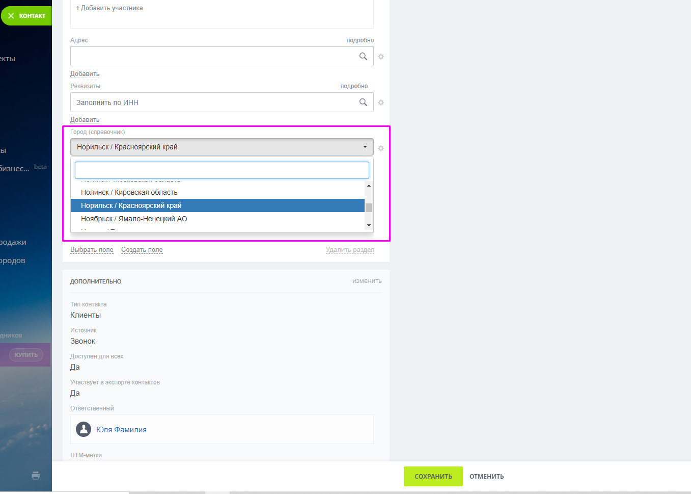 - Создавайте несколько пользовательских полей с новым типом "Город (справочник)"