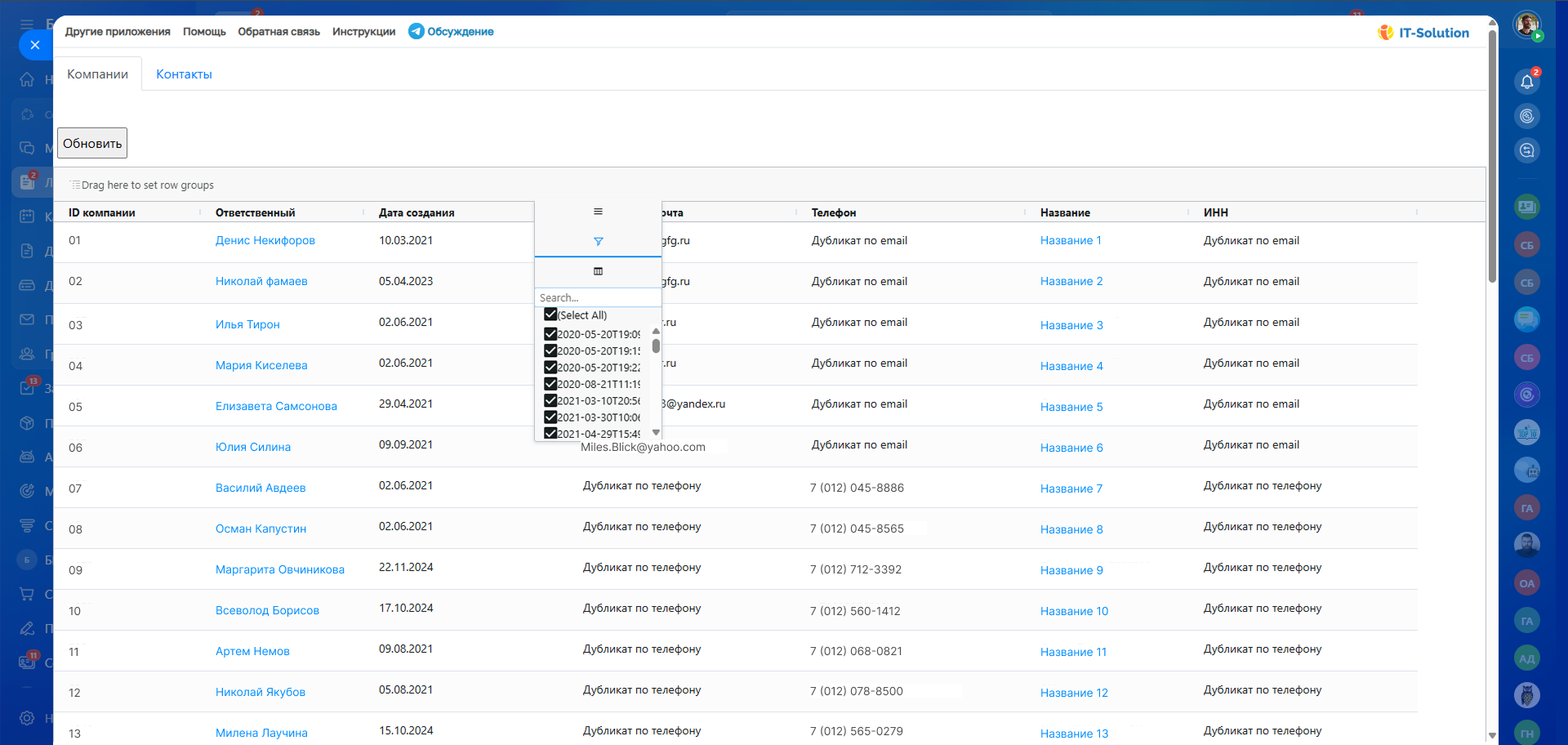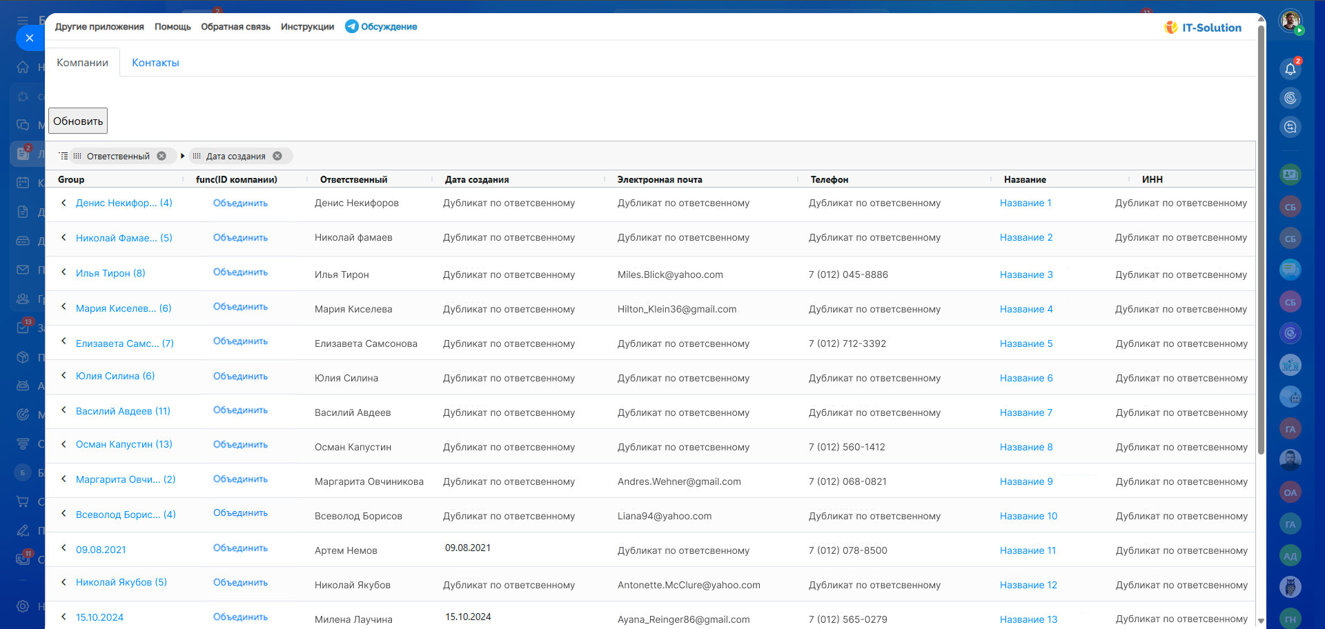 Приложение позволяет получить удобный список возможных дублей в CRM в виде удобной таблицы с группировкой по столбцам