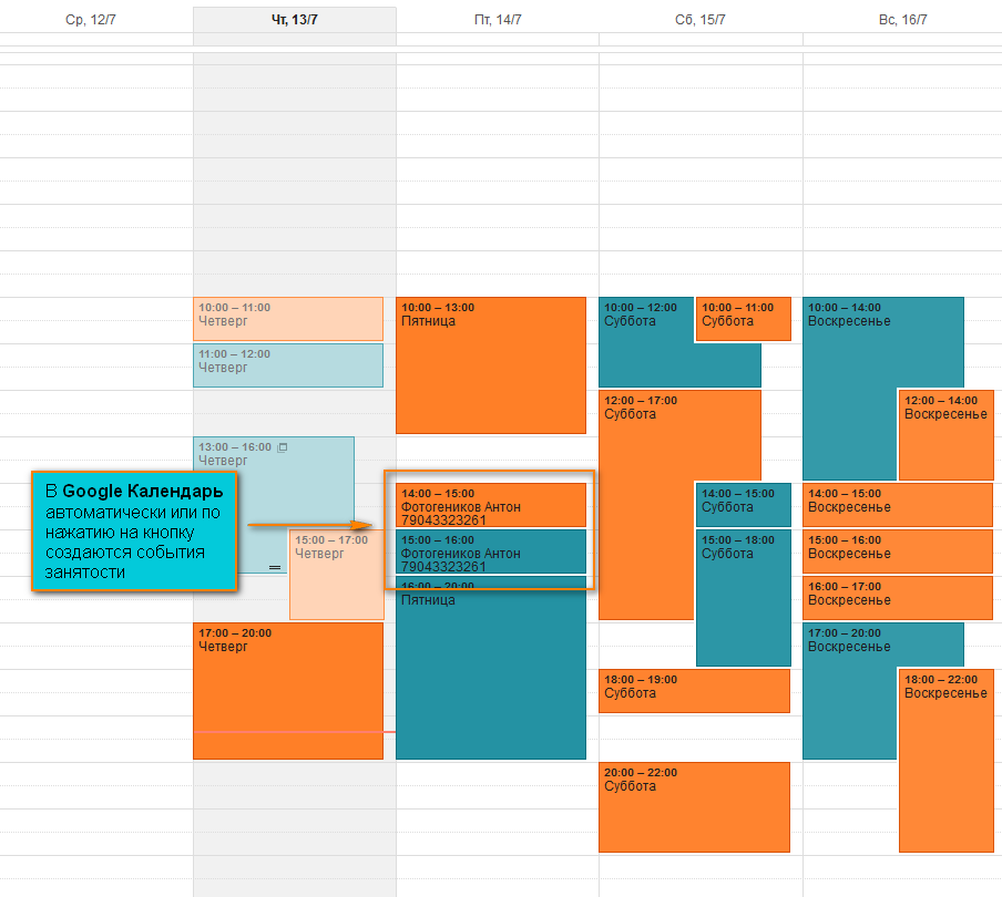 - функциональные события занятости (статус "Оплачено"/"Не оплачено", удаление событий из календаря Администратором, клиенты видят свои события с возможностью отправлять заявки на отмену брони и др);