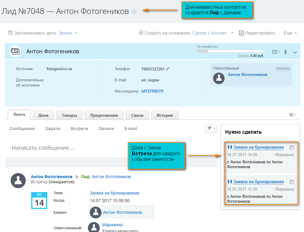 - создание Лида с Товарами в нем + дел с типом Встреча у Лида или Контакт + Сделки с Товаром в них + дело с типом Встреча у Сделок, если контакты еще не добавлены в CRM;