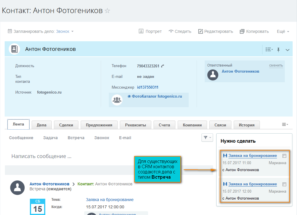- создание Сделок с Товаром в них + дело с типом Встреча у Сделки для существующих в CRM Контактов/Компаний.