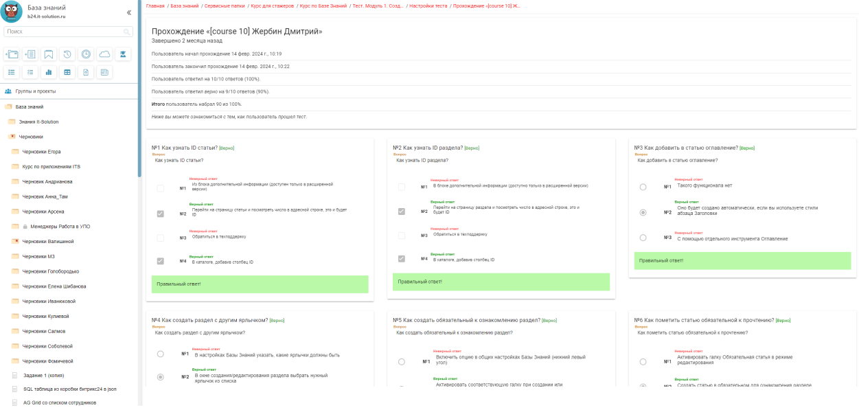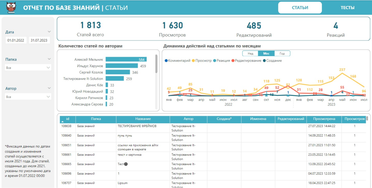 Данные по количеству статей в Базе знаний и персональная статистика пользователей.