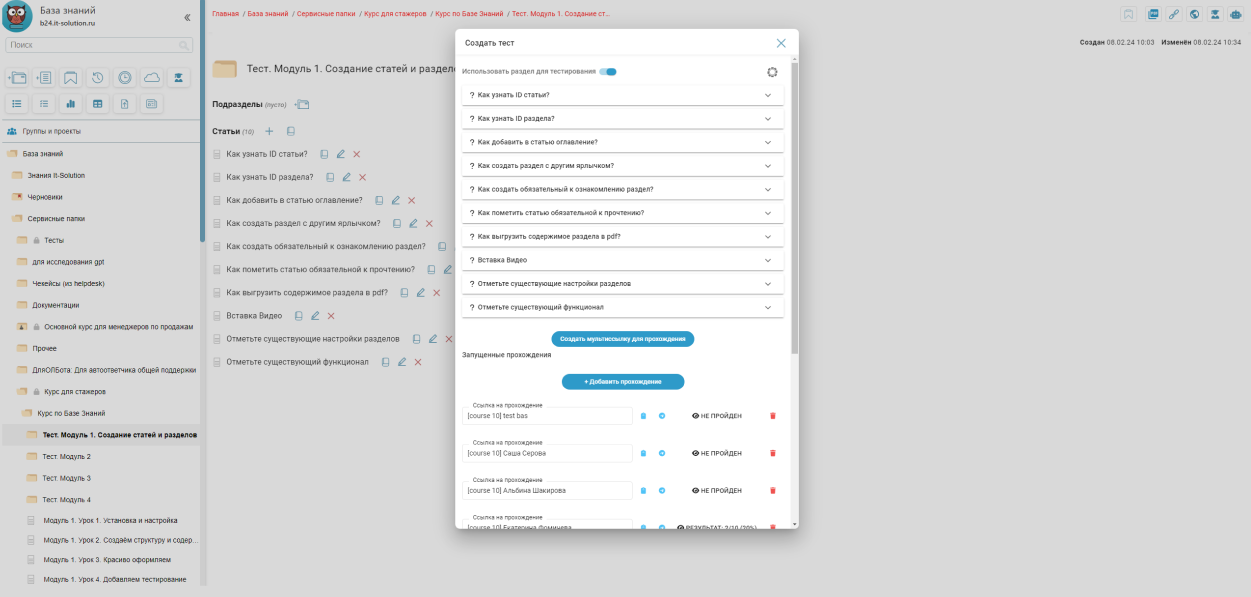 Приложение позволяет Вам создавать и редактировать статьи, следить за историей изменений и делиться знаниями с другими сотрудниками. Иными словами, Вы можете получить маленькую версию Википедии прямо на Вашем портале Битрикс24, а также создавать тесты для сотрудников и клиентов.