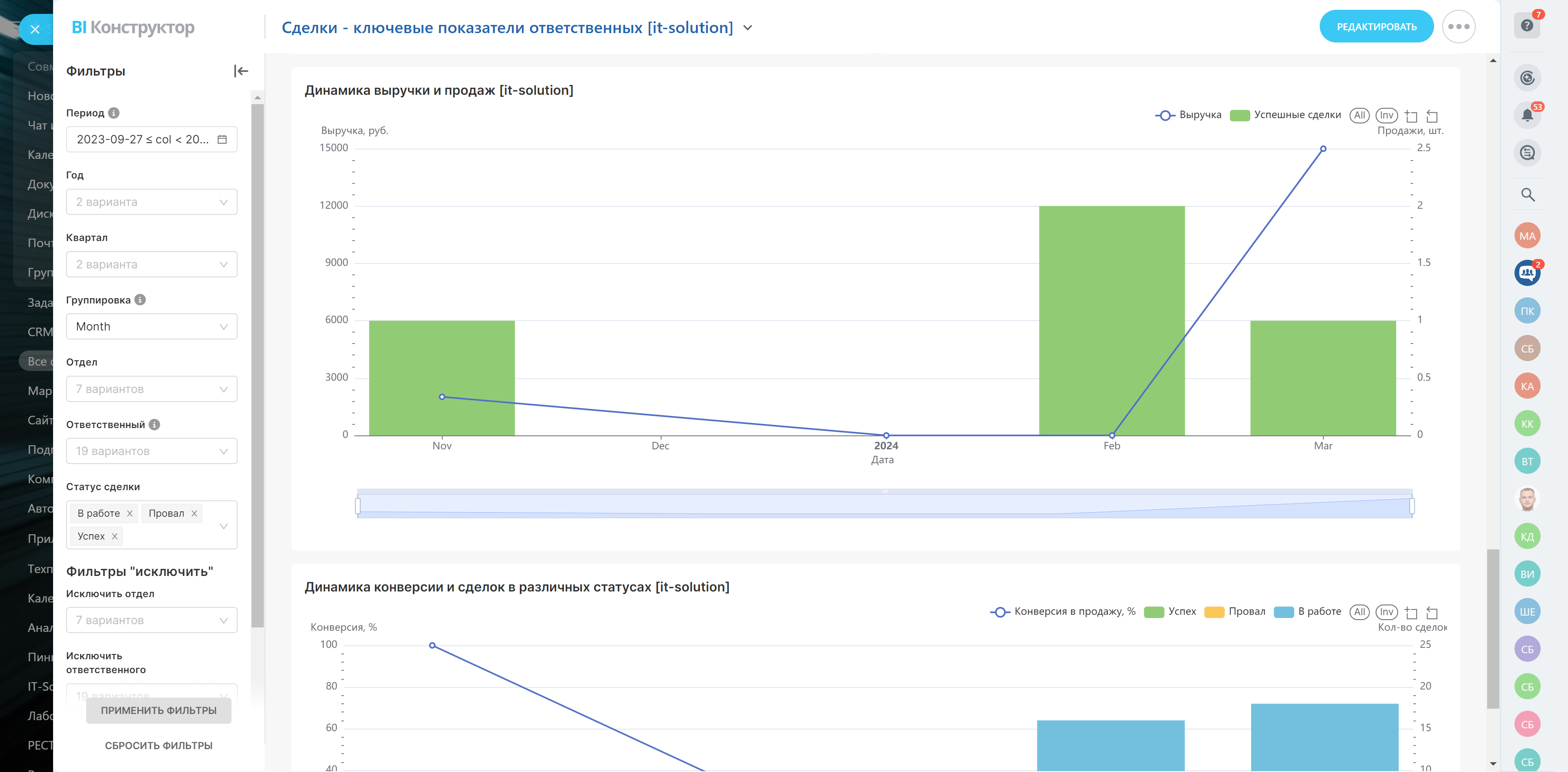 - Динамика конверсии и сделок в различных статусах.